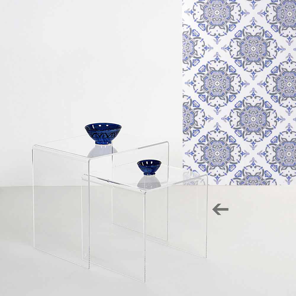 Modernes Design transparenter Couchtisch 40x40cm Terry Small, made in Italy Vielseitiger Couchtisch / Nachttisch, inspiriert von der Geometrie der 80er Jahre, aus 100% reinem Polymer-Plexiglas, lasergeschnitten und bei hohen Temperaturen gebogen. Die wichtige Dicke macht die Struktur völlig selbsttragend. Es kann einzeln verkauft werden, ist aber perfekt, wenn es mit dem Twin TERRY BIG kombiniert wird. Plexiglas ist stoßfest, nicht verformbar, unveränderbar und wärmeisolierend. Die Helligkeit und Helligkeit werden über die Zeit konstant und unverändert beibehalten. Das PMMA Plexiglas aus reinem Polymer ist ungiftig, hypoallergen, geruchlos und antibakteriell. 100% recycelbar. Entworfen, entworfen und hergestellt in Italien, mit italienischen Materialien.