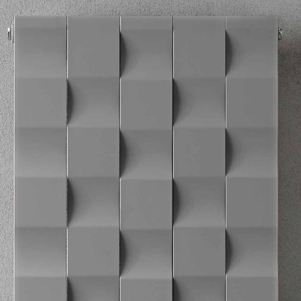 Der hydraulische Wandheizkörper hat ein modernes Design, das durch eine durch Subtraktion erzeugte Oberfläche gekennzeichnet ist, die dem Körper  Wärmeverleiht.