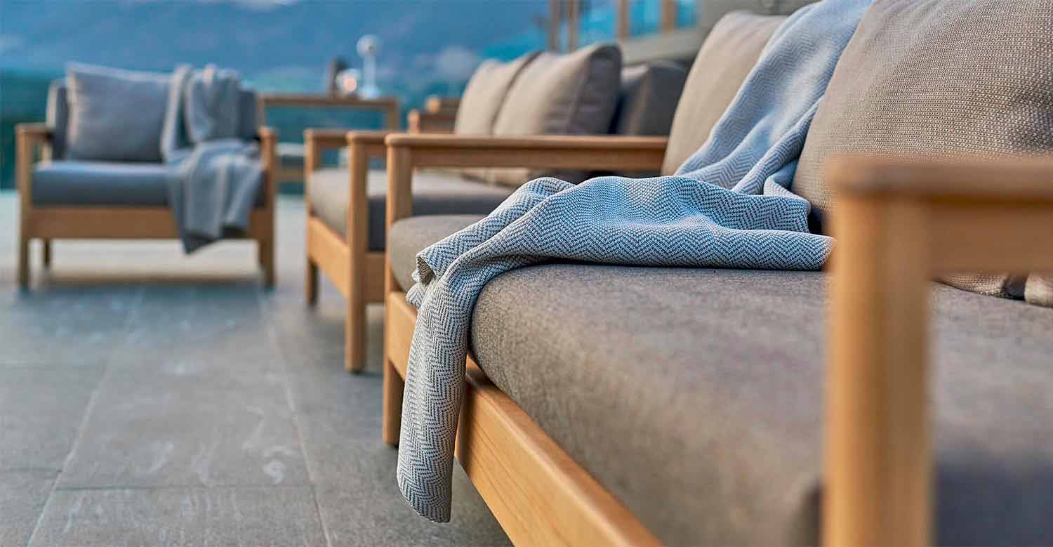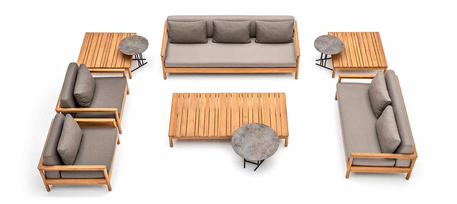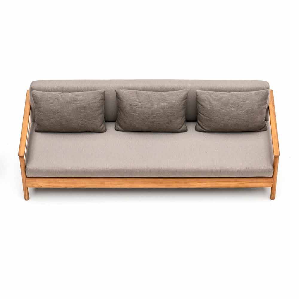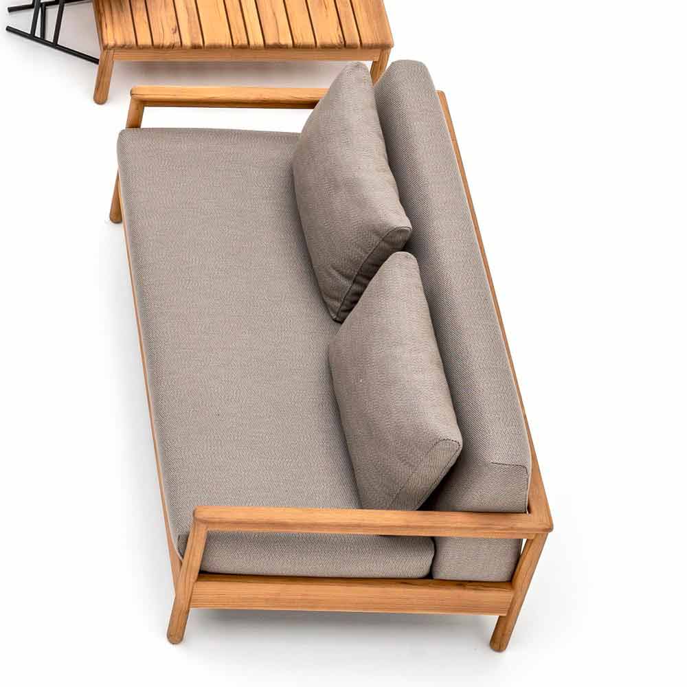 Bali ist ein fantasctisches Gartensofa, das sich durch eine tragende Struktur aus massivem Teakholz von zertifizierten Plantagen auszeichnet. Die Sitze und doppelten Rücken sind mit Stoff bezogen und mit Dryfeel-Gummi gepolstert.