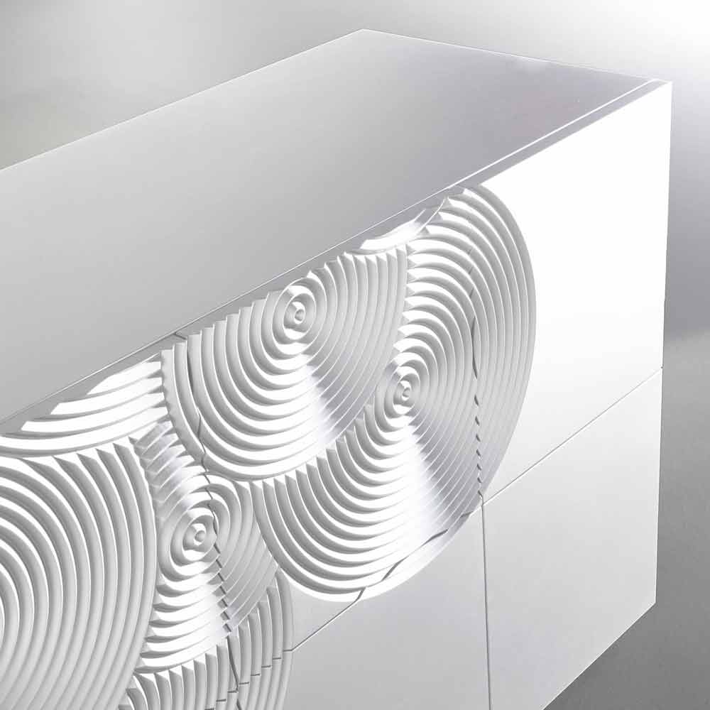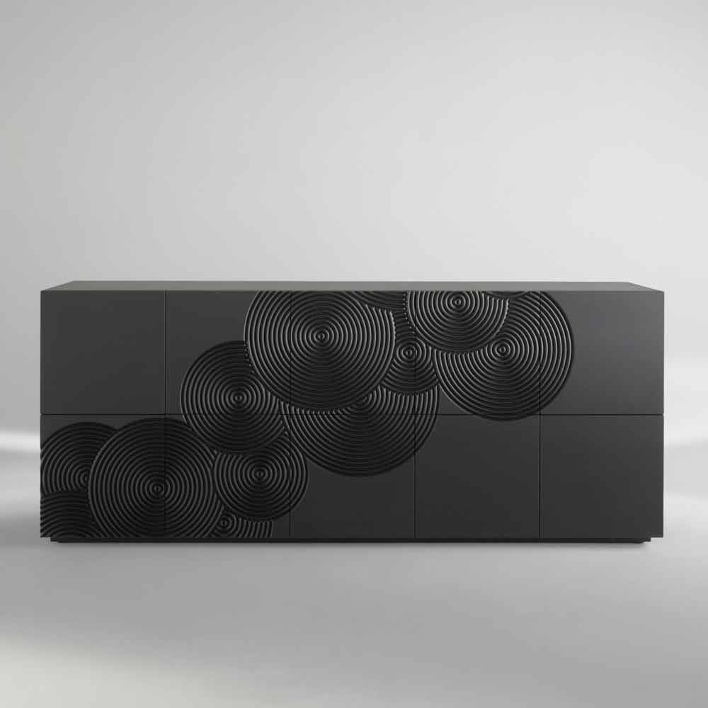 Madia ist mit Ihren 10 Schranktüren ein echtes High Light in Sachen Stauraum, im Innenraum befinden sich 6 Aufbewahrungsregale die für Ordnung sorgen. Das italienische Design richtet sich nach einen schlichten und einfachen Aufbau, klare Linien und einer skulpturartigen Wirkung. Die Oberfläche des Sideboard besteht aus lackierten MDF und wurde mit kreisenden Musterringen optisch aufgewertet, die eine harmonische Atmosphäre verleihen.