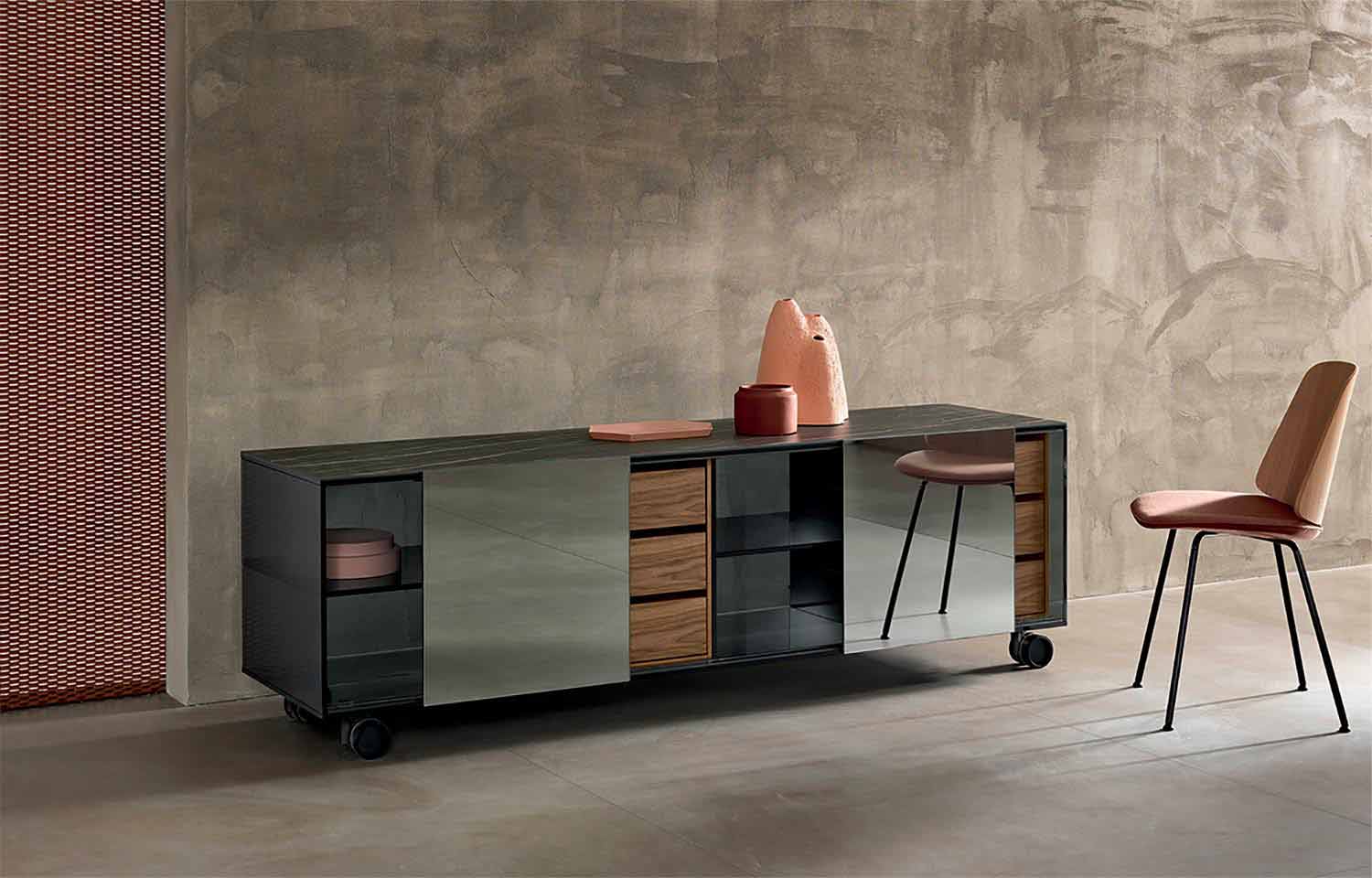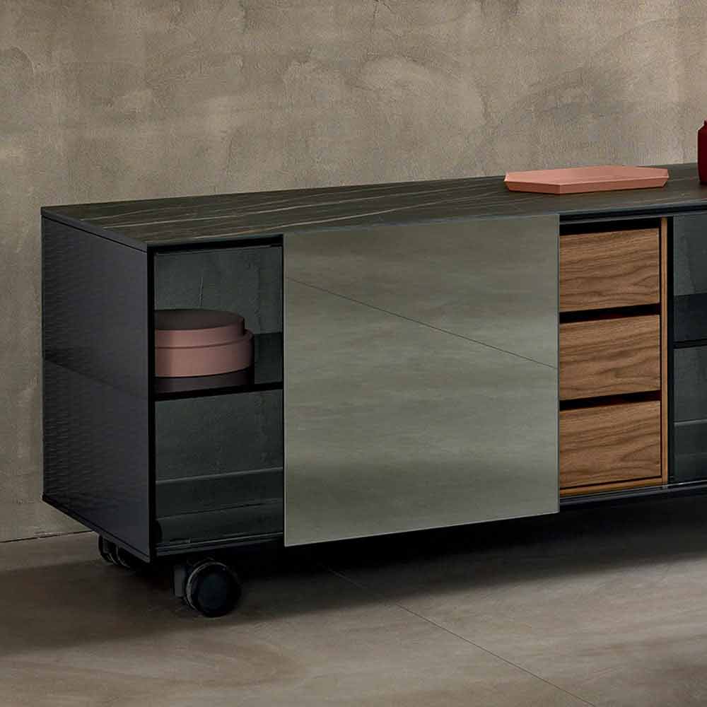 Modernes Wohnzimmer Sideboard auf Rädern mit einer rauchigen Glasstruktur und einer Noir Desir Keramikplatte, von Hand in Italien realisiert.