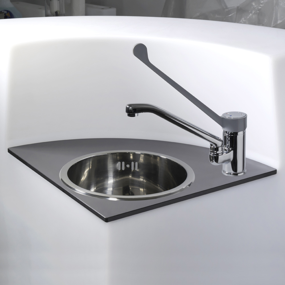 Die Version mit Handwaschset besteht aus einer vorgebohrten anthrazitfarbenen HPL-Platte, Mischbatterie, Spülbecken und Ablaufsystem.