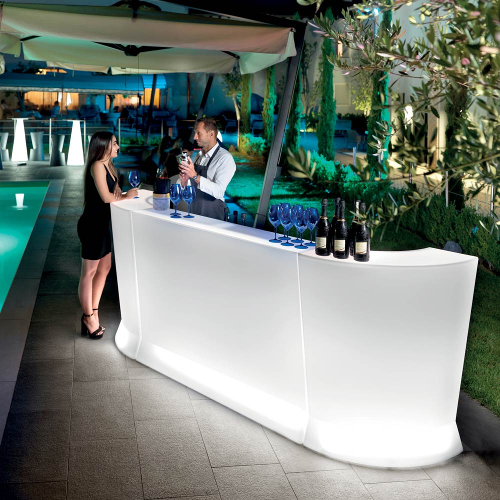 Bartheke für Veranstaltungen mit Außenbeleuchtung, erhältlich mit 36 W klassischer weißer LED oder 27 W RGBW-LED. Die Theke passt sich jedem Bedarf an Form und Raum an, jeden Tag und jeden Abend. Sie ist perfekt für die Organisation temporärer Veranstaltungen.