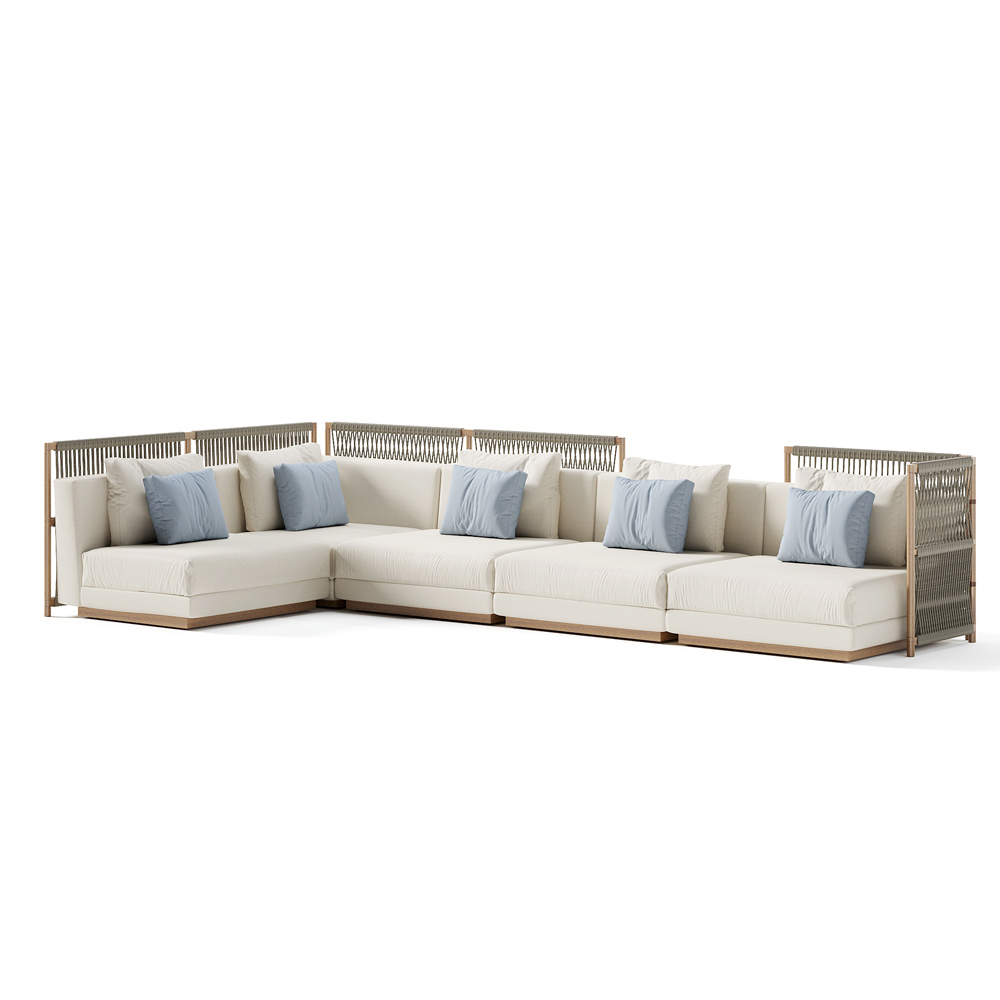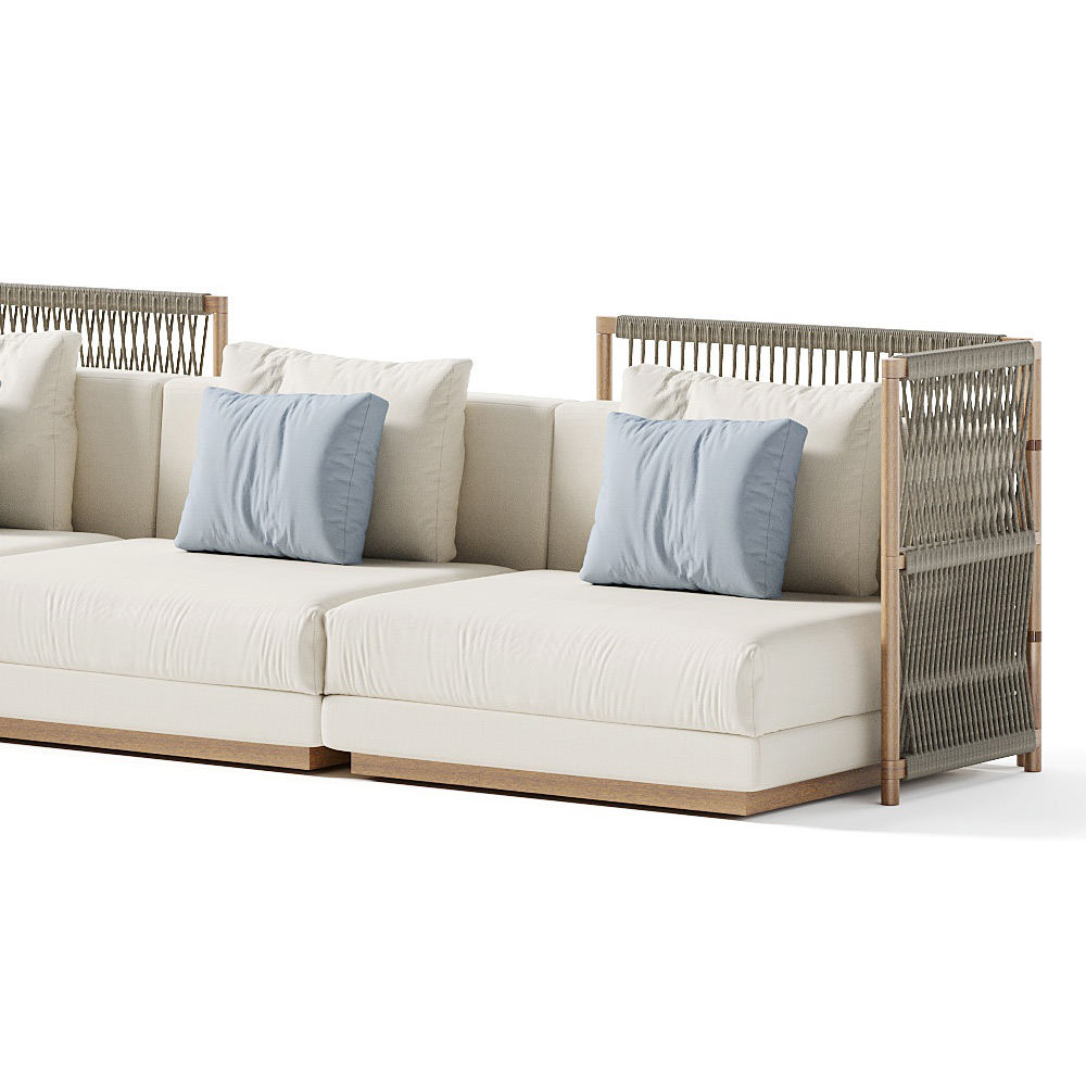 Komplett in Italien hergestelltes modulares Gartensofa mit Sitz- und Rückenkissen aus gepolstertem Stoff. Das Produkt besteht aus einem niedrigen und tiefen Sitz und dank der großen Kissen wird es zu einem einladenden und einladenden System, das eine entspannte und informelle Atmosphäre schaffen soll. Dieses Sofa ist perfekt, um jede Umgebung einzigartig zu machen, und bietet die Freiheit, Ihre Wohnräume mit Geschmack und Stil neu zu gestalten. Dank seiner einfachen und linearen Oberflächen garantiert es Eleganz und Raffinesse für jede Umgebung, in der es platziert wird. Die Variante mit der Struktur aus Iroko-Holz und grünem Seilgeflecht erinnert dank ihrer Dekoration an die handwerkliche Tradition des Webens und verleiht der Komposition einen Hauch von einzigartiger Identität , während sie ein rein dekoratives Element bleibt. Diese Struktur kann auch als freistehende Trennwand verwendet werden.