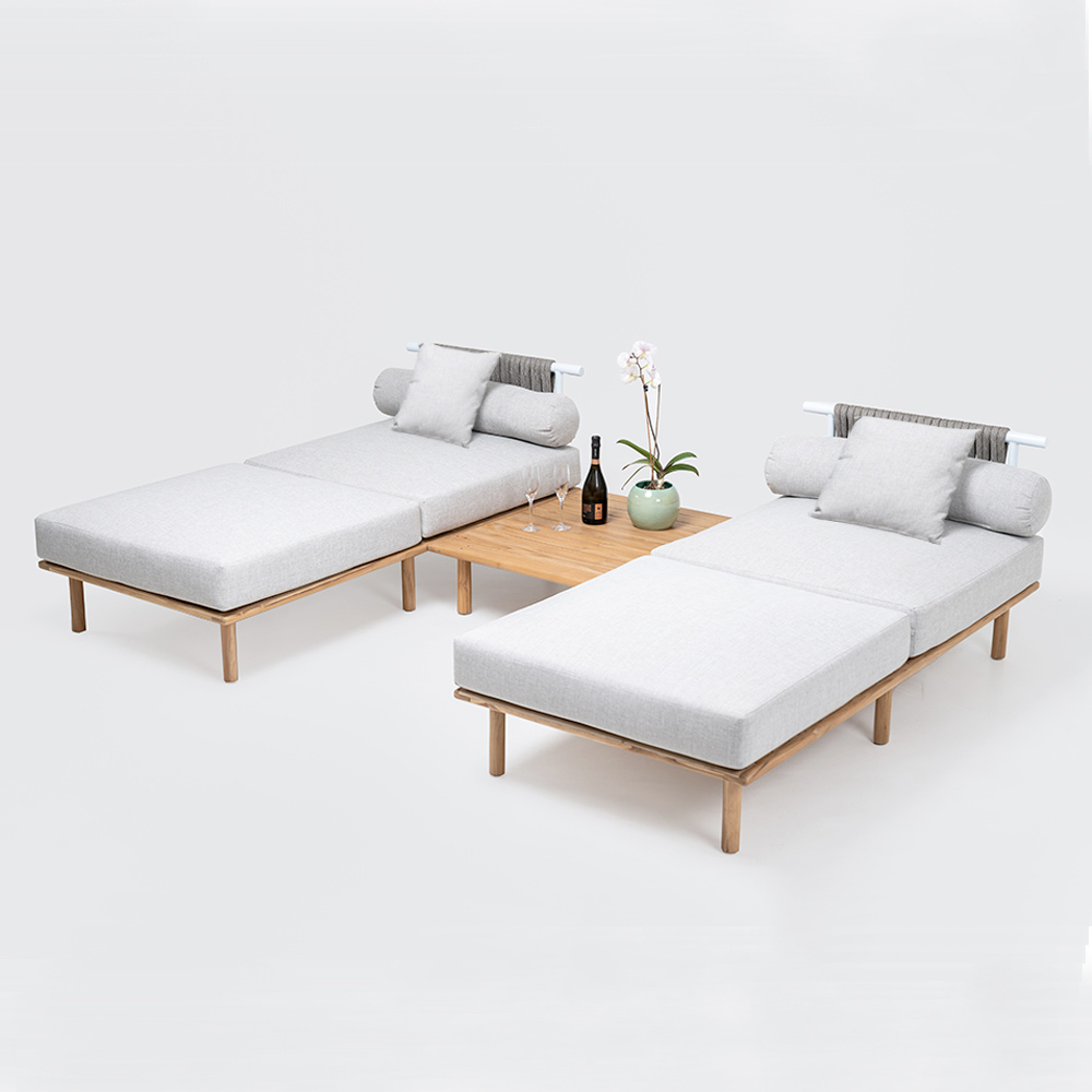 Dieses modulare Gartenset ist der Inbegriff von Vielseitigkeit und Stil . Entworfen, um sich elegant und funktionell in jeden Außenbereich einzufügen, zeichnet es sich durch die Kombination von natürlichen Materialien und zeitgenössischem Design aus. Teakholz , bekannt für seine Stärke und Langlebigkeit, bildet die solide Basis, auf der weiche und einladende hellgraue Kissen ruhen.