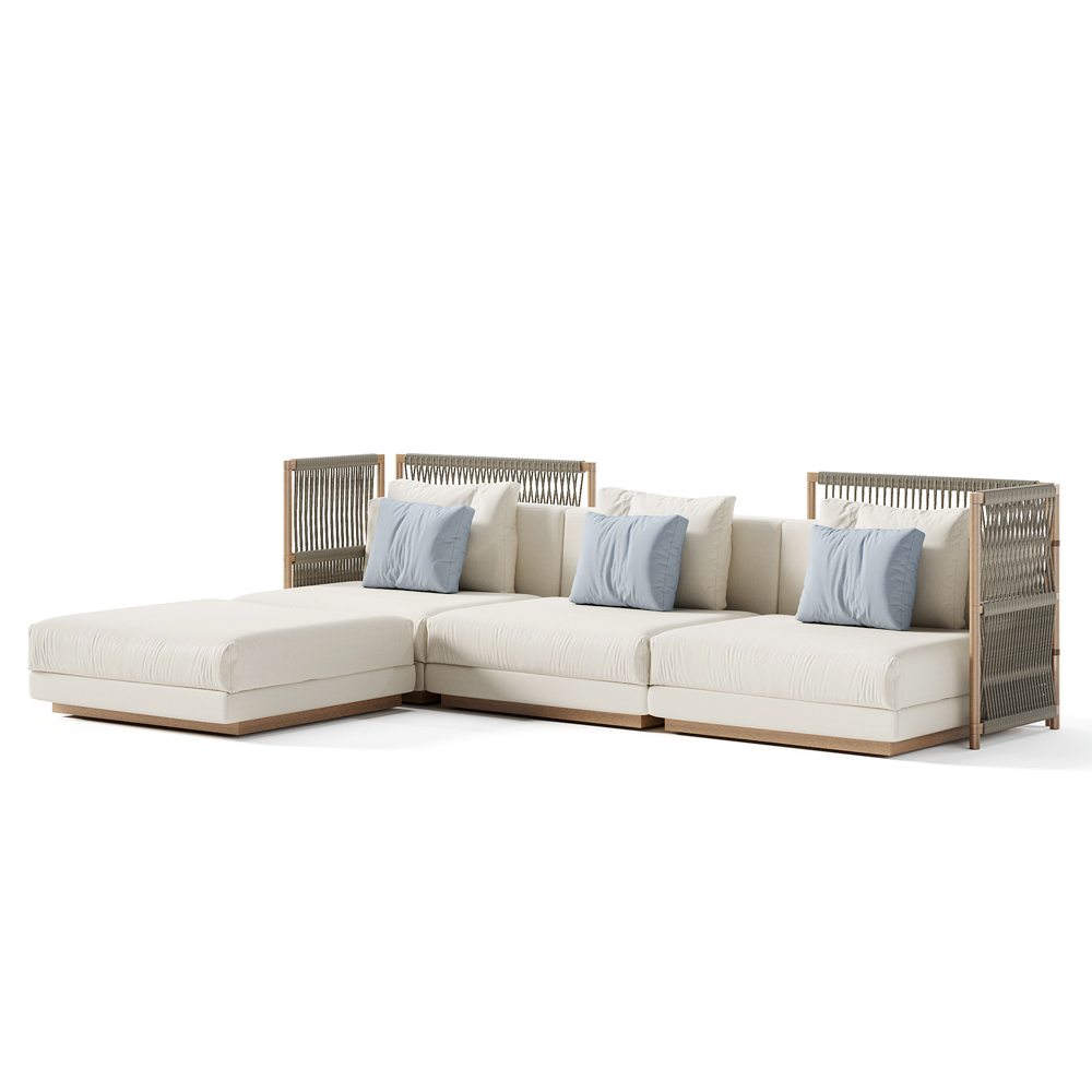Modulares Gartensofa, vollständig in Italien hergestellt , mit Sitz- und Rückenkissen aus gepolstertem Stoff. Das Produkt besteht aus einem niedrigen und tiefen Sitz und wird dank der großen Kissen zu einem einladenden und einladenden System, das eine entspannte und ungezwungene Atmosphäre schafft. Dieses Sofa ist perfekt, um jede Umgebung einzigartig zu machen und bietet die Freiheit, Ihre Wohnräume mit Geschmack und Stil neu zu gestalten. Dank seiner schlichten und geradlinigen Verarbeitung verleiht es jeder Umgebung, in der es platziert wird , Eleganz und Raffinesse . Die Variante mit Iroko-Holzstruktur und grünem Seilgeflecht erinnert dank ihrer Verzierung an die handwerkliche Tradition des Webens und verleiht der Komposition einen Hauch einzigartiger Identität , bleibt aber lediglich ein dekoratives Element. Diese Struktur kann auch als freistehende Trenntäfelung verwendet werden.