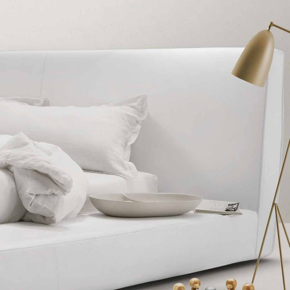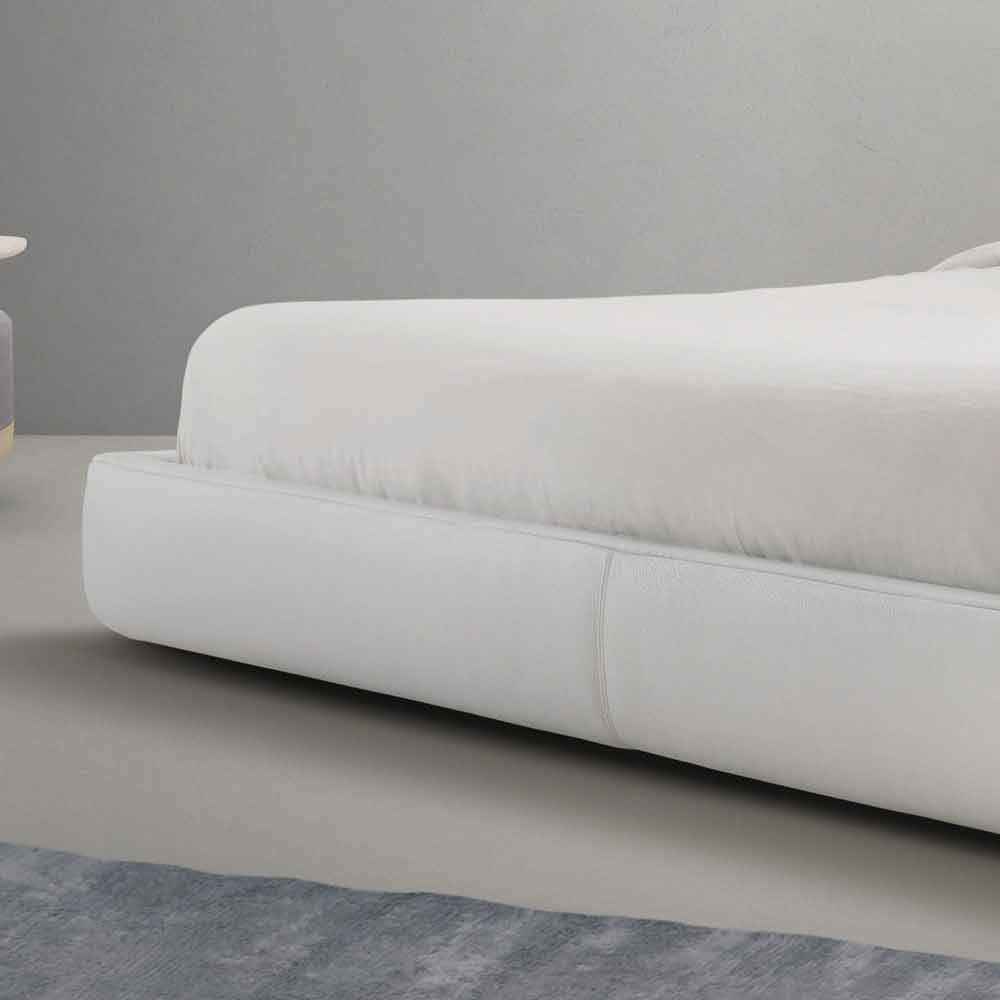 Long Island verfügt über ein Kopfteil und einen Bettrahmen aus Holz, die mit Polyurethankautschuk und einer Polyesterfaserauskleidung überzogen sind. Einstreichenabnehmbarer Bezug aus weißem Leder, Lattenrost aus Buchenholz.