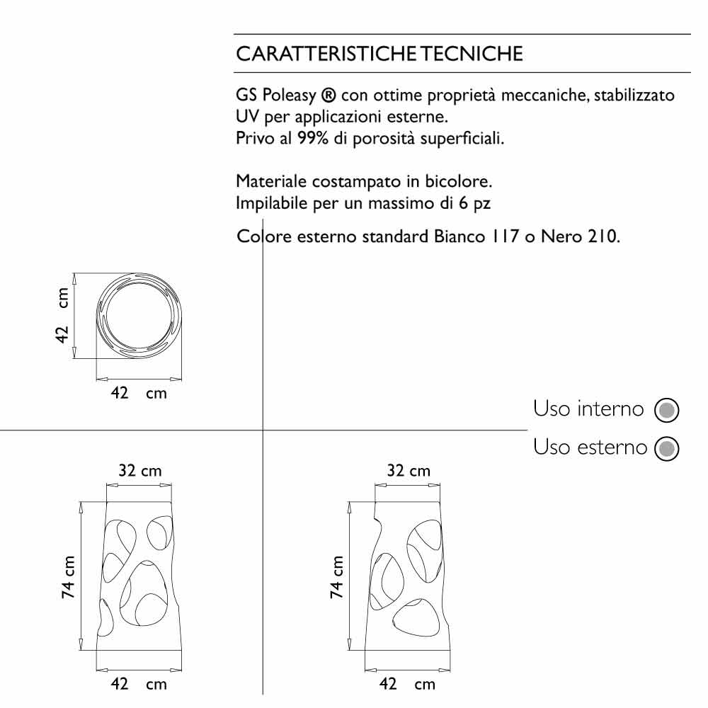 Die Lebendigkeit der Freiheit beruht auf dem offenen Spiel von Hohlräumen und Festkörpern auf Oberflächen und Volumina, die durch chromatische Schwingungen innerviert werden. Die großen Löcher im hohlen Stamm verstärken mit ihrer Asymmetrie die Energie der zweifarbigen Oberfläche. Und im Triumph des konischen Abschnitts werden die Räume vergrößert: Perfekt stapelbar, belegen und befreien die LIbery-Hocker die Räume mit einem originellen Hauch von Design.