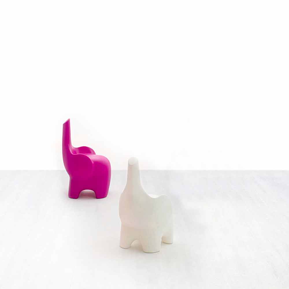 Die Idee ist, einen Stuhl für Kinder zu schaffen, der auch ein Spiel ist: ein Tier, der Elefant, der in der Lage ist, Empathie und Identifikation des Kindes gegenüber seinem Spiel zu erzeugen. Transaktionsobjekt, es erinnert an Zärtlichkeit, Stärke, Mut und Schönheit in der Kleinen. Die weiche und süße Form macht das Objekt zu einem Maskottchen. Der Stamm von Tino wird nach oben gedreht, wird zu einer Rückenlehne und nimmt die glückverheißende Symbolik des Elefanten auf.