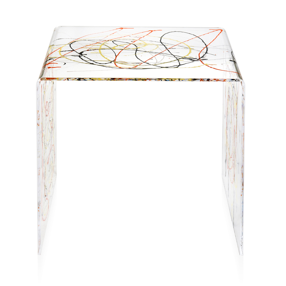 Dieser Nachttisch mit vielseitigem Design ist vollständig aus transparentem Plexiglas aus 100 % reinem Polymer mit mehrfarbiger Lackierung als Hommage an Jackson Pollock gefertigt, lasergeschnitten und bei hohen Temperaturen gebogen. Die beträchtliche Dicke macht die Struktur völlig selbsttragend.
