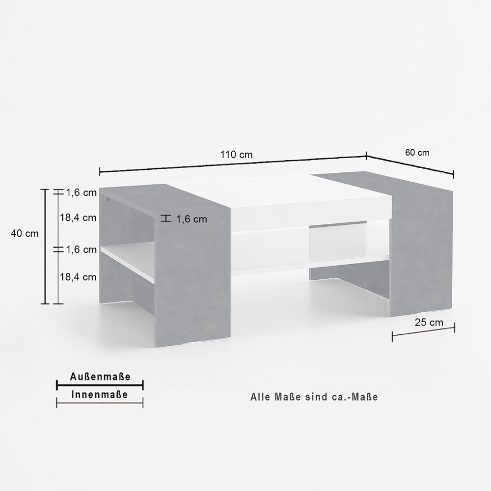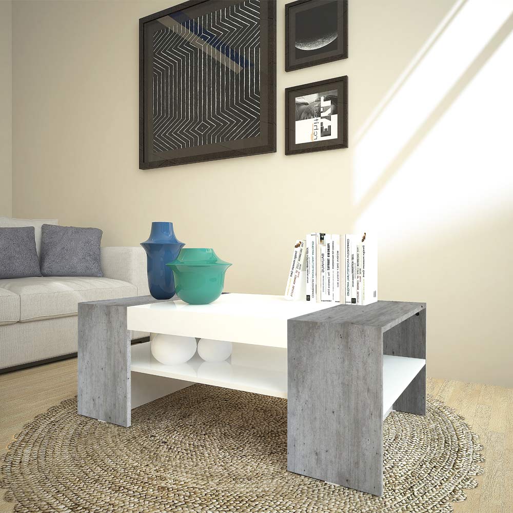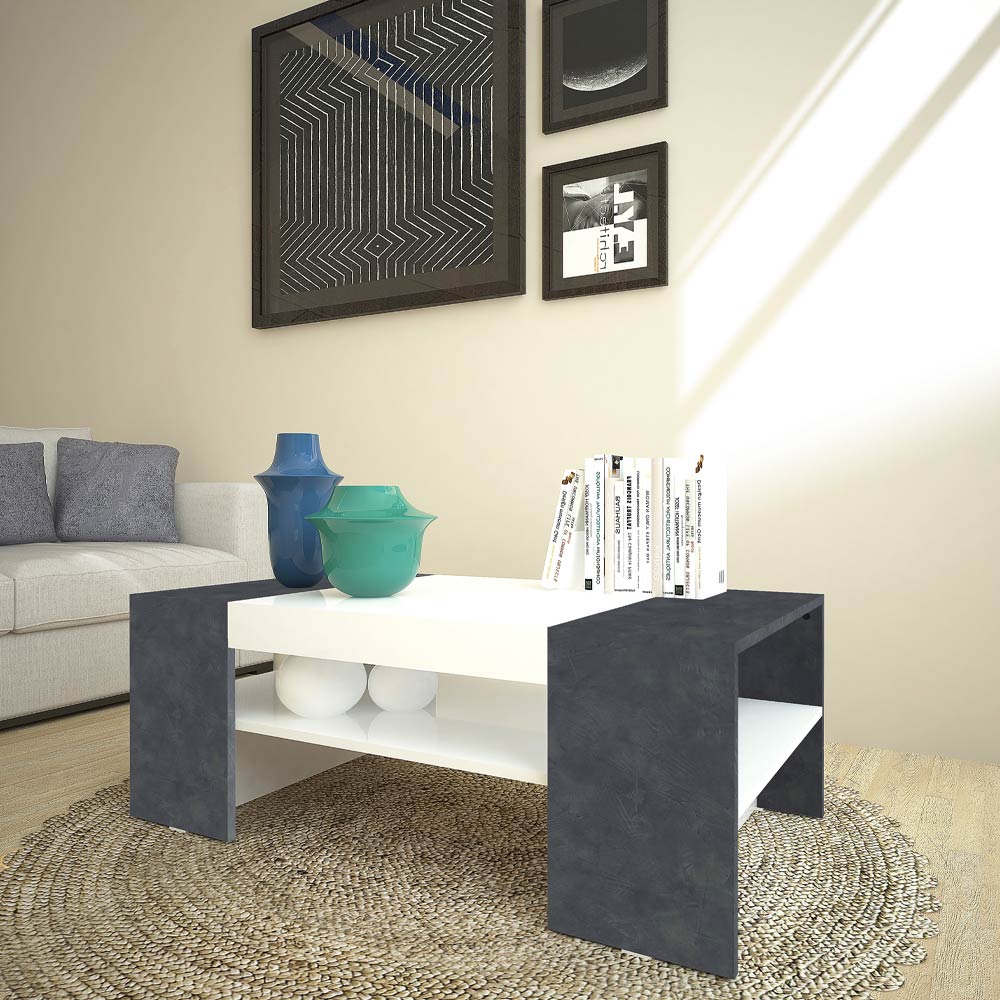 Der Couchtisch für das Wohnzimmer hat ein elegantes, minimalistisches und geometrisches Design mit zwei Platten aus nachhaltigem, glänzend weiß lackiertem Holz und einer großen Stützstruktur, die in 3 Ausführungen erhältlich ist.