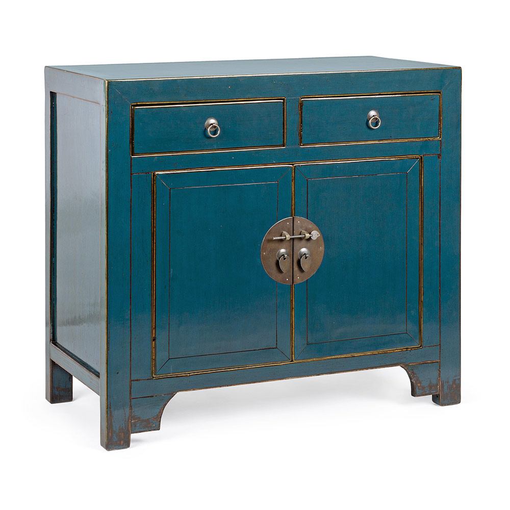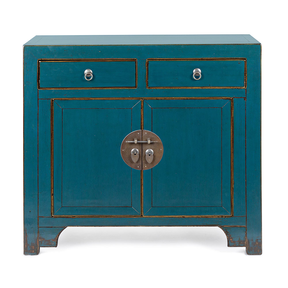 Niedriger Schrank aus blauem Ulmenholz mit 2 Türen und 2 Schubladen, Design im Vintage-Stil.