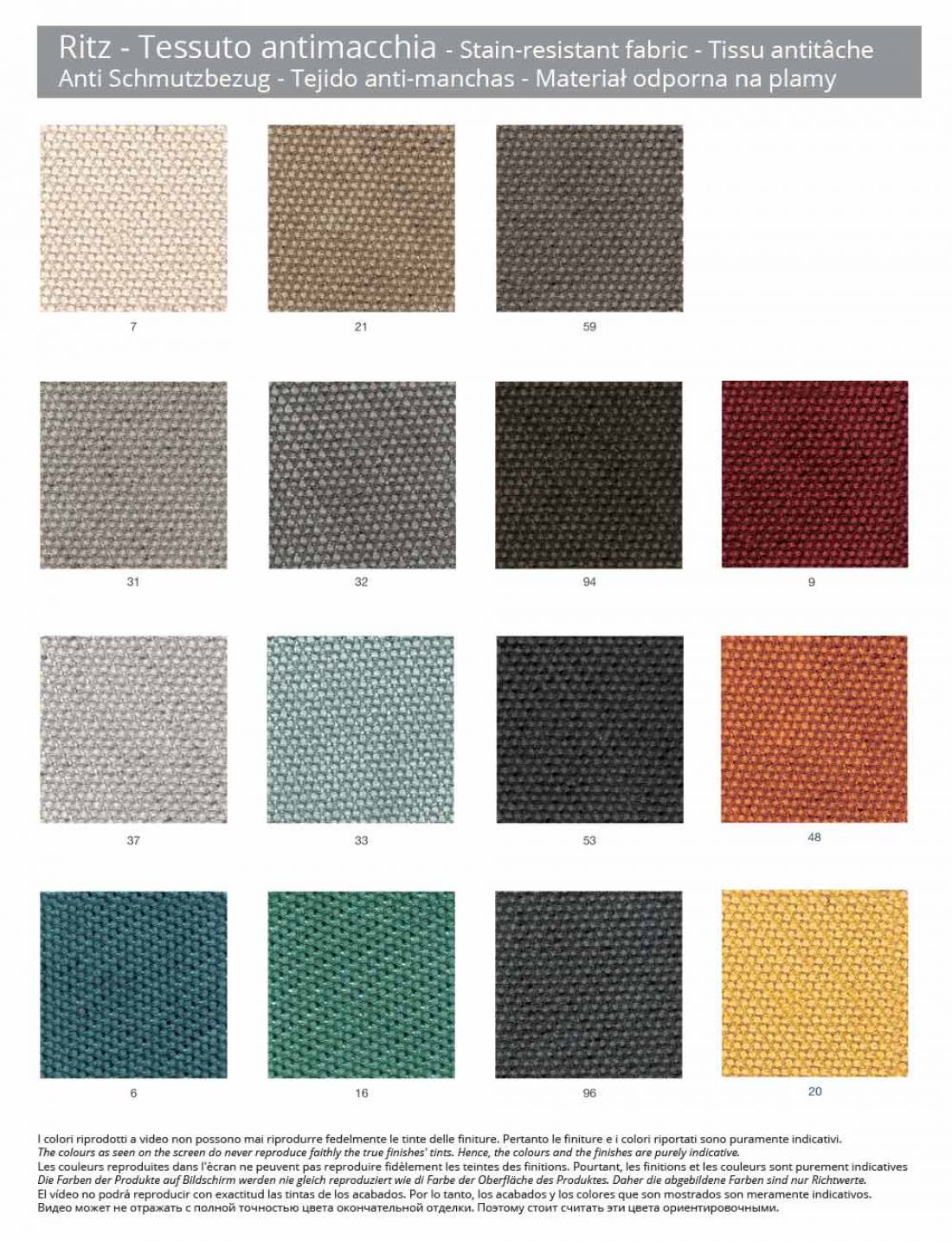 - schmutzabweisendes Ritz -Gewebe; Ritz ist ein Stoff mit angenehmer Haptik, der aufgrund seiner charakteristischen Verschleißfestigkeit als Bezug für diese Sessel ausgewählt wurde. Es handelt sich um einen schmutzabweisenden Stoff, der aus 86 % Polyester und 14 % Polyamid besteht. Gewicht/Dicke 490 g/ml.