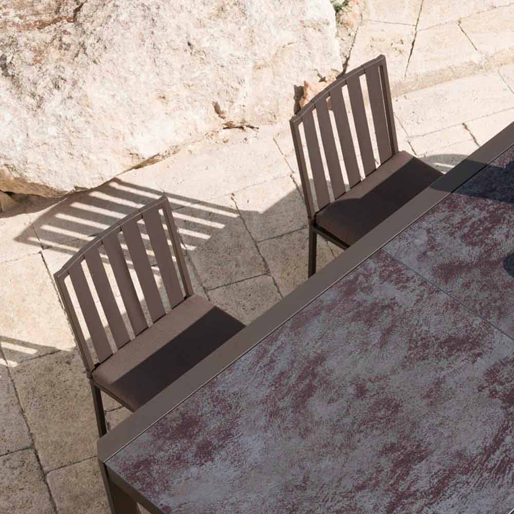 Das raffinierte , elegante und raffinierte Design dieses Outdoor-Stuhls zeichnet sich durch den Wechsel von leeren und vollen Räumen aus, der ein leichtes und zeitgemäßes Erscheinungsbild schafft.