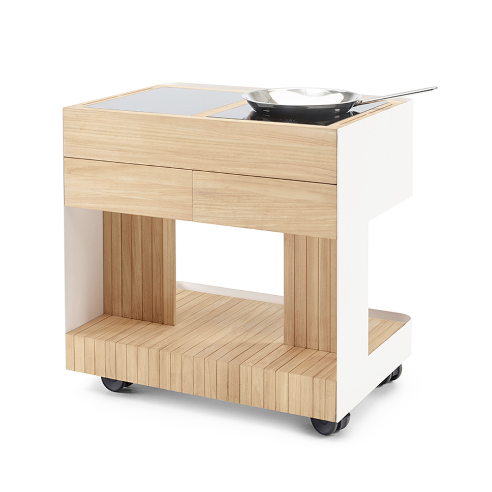 Diese Outdoorküche stellt die perfekte Mischung aus Funktionalität und zeitgenössischem Design dar, ideal um jeden Moment im Freien zu einem einzigartigen Erlebnis zu machen. Der pulverbeschichtete Aluminiumrahmen bietet Robustheit und Witterungsbeständigkeit, während die hochwertigen massiven Teak-Einsätze, die mit Rubio Monocoat Hybrid Wood Protector behandelt wurden, einen Hauch von natürlicher Eleganz und visueller Wärme verleihen.