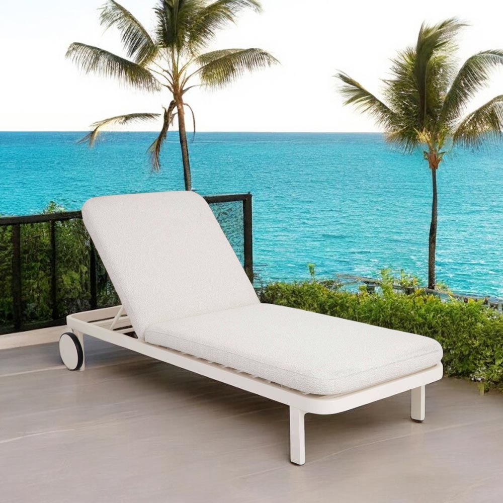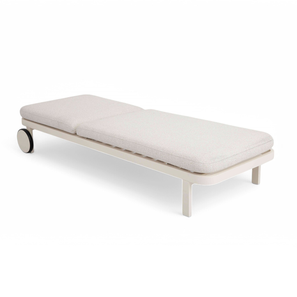 Das minimalistische Design wird durch durchdachte Details bereichert, wie die integrierten Räder, die es einfach machen, sie zu bewegen, wo immer Sie wollen, nachdem Sie Ihre Momente der Entspannung in der Sonne oder im Schatten genießen. Die gepolsterte Matratze, bezogen mit wetterfestem Stoff, garantiert außergewöhnlichen Komfort und Langlebigkeit.