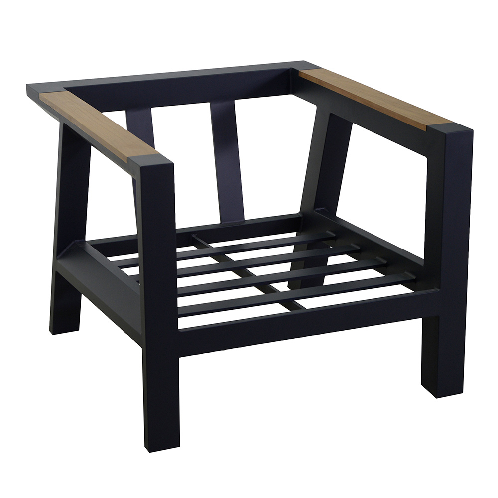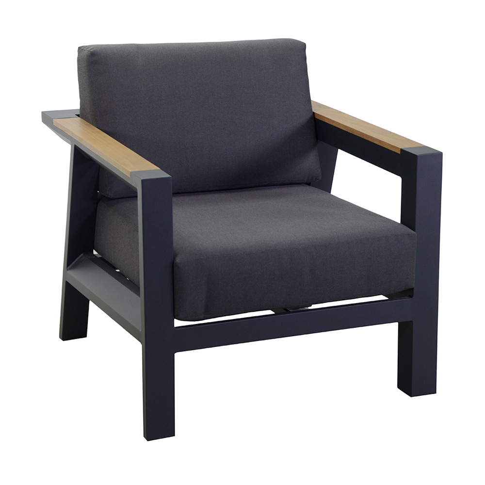 Ausgestattet mit Armlehnen mit Holzeinsätzen ist diese Lounge nicht nur ästhetisch ansprechend, sondern auch funktional und bietet eine komfortable Unterstützung für Momente der Entspannung im Freien.