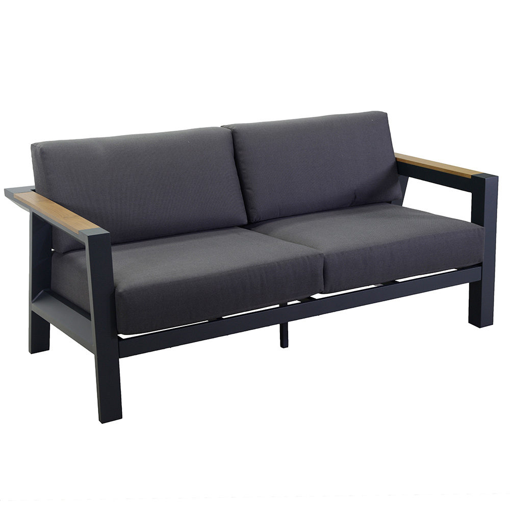 1 Sofa: Gestell aus rostfreiem pulverbeschichtetem Aluminium in Anthrazit, wasserabweisende Kissen aus dunkelgrauem Polyester, abnehmbare Bezüge und Armlehnen aus TEAK-Holz aus Brasilien