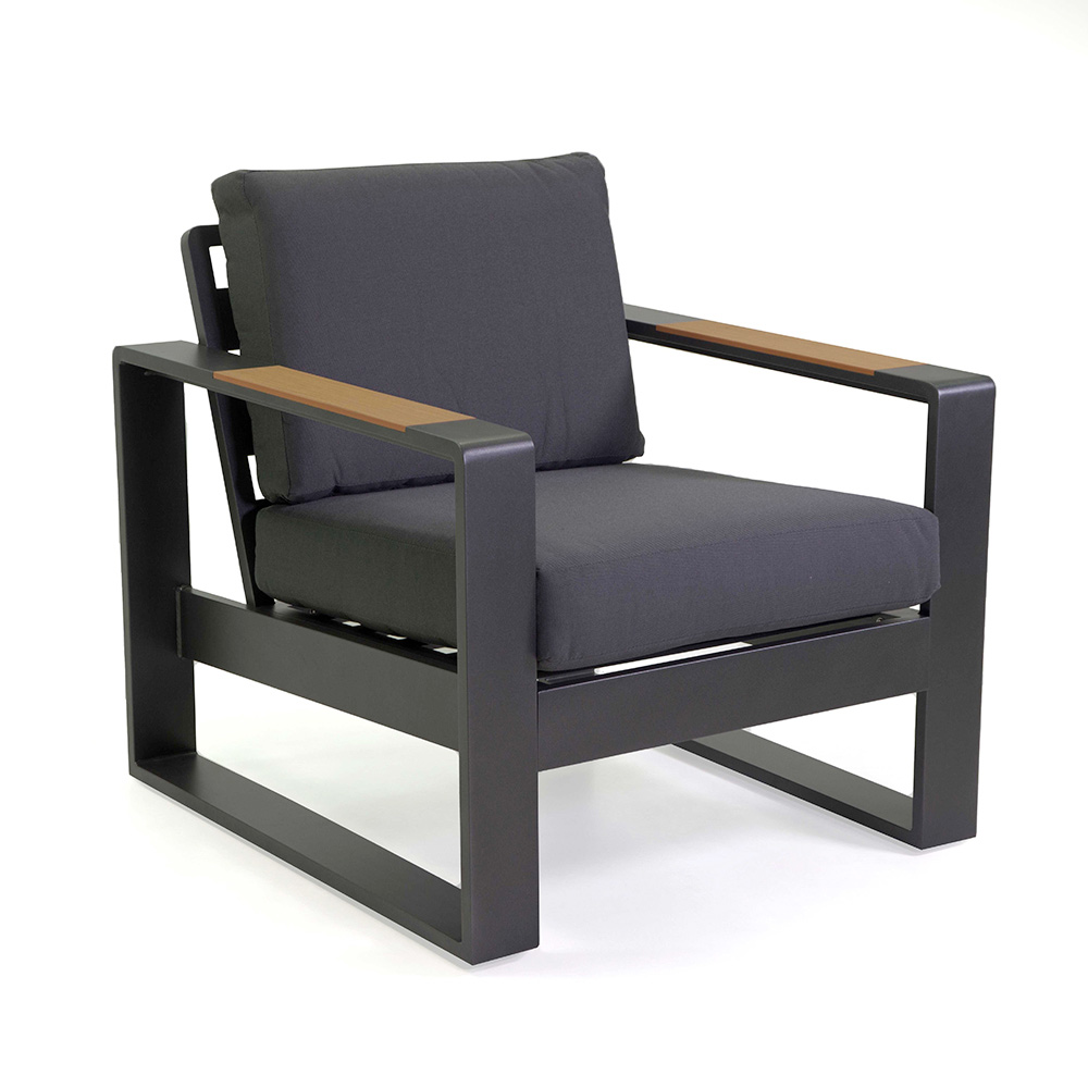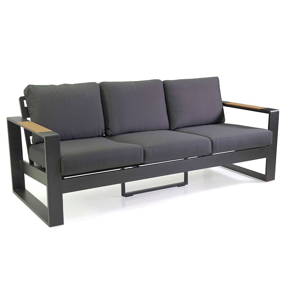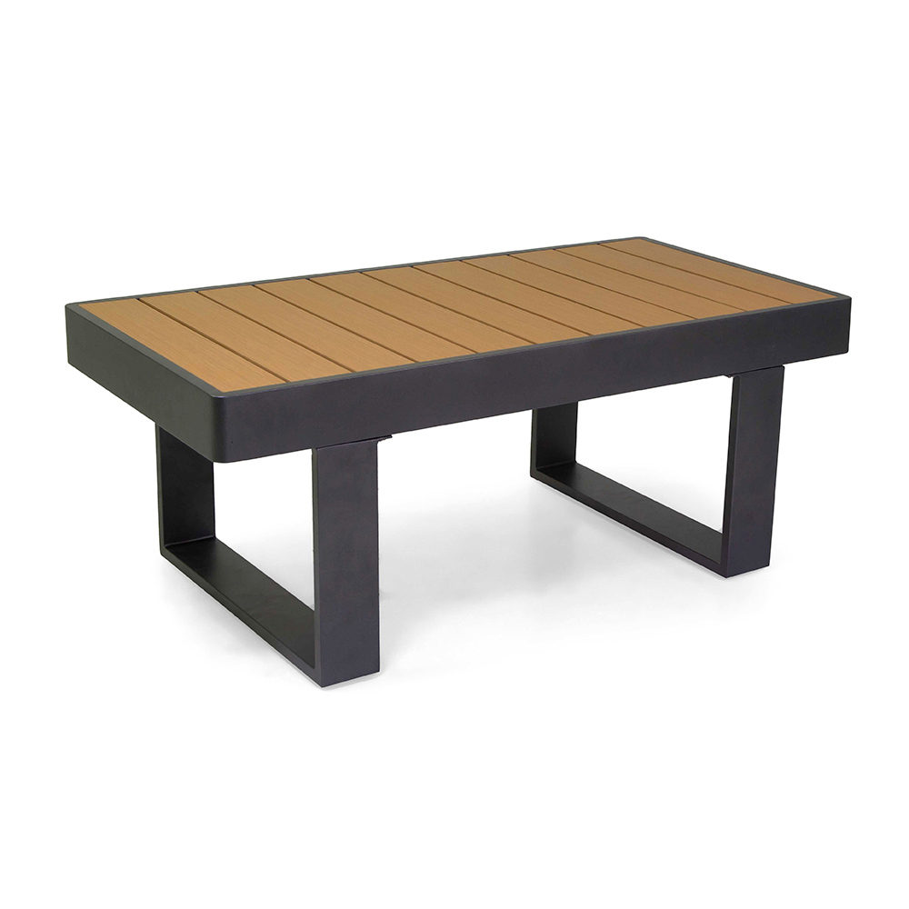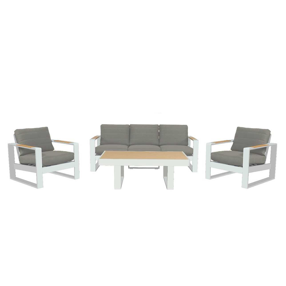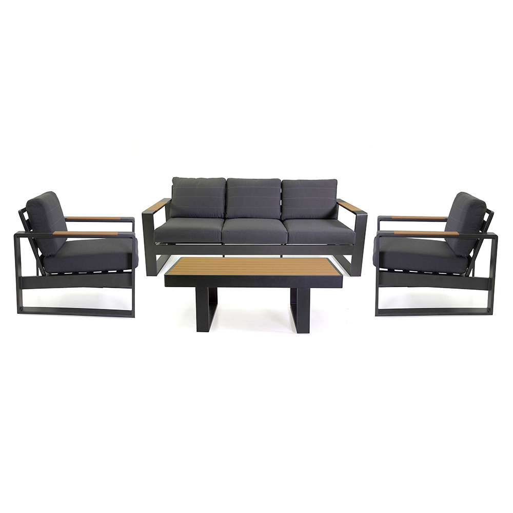 Die Armlehnen aus Holz verleihen ihm einen Hauch von natürlicher Wärme, die einen schönen Kontrast zum Gestell bildet und eine einladende Atmosphäre zum Entspannen oder Unterhalten schafft. Der passende Couchtisch ist perfekt, um Getränke und Snacks griffbereit zu haben und macht dieses Set zu einer ausgezeichneten Wahl für jede Terrasse oder jeden Garten.