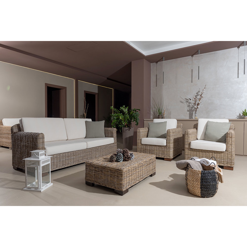 Das Wohnzimmer gehört zu einer ganzen Kollektion, die durch das naturgraue Kubu mit geraden Linien und einer breiten Sitzfläche gekennzeichnet ist. Kubu ist ein natürliches Material, das zu den resistentesten gehört, die man in der Natur finden kann, das aber immer sehr leicht bleibt. Komfort und Wesentlichkeit in einem zeitlosen Stil, der dank der Verwendung von Naturfasern, die die Natur bereitstellt, Gestalt annimmt.