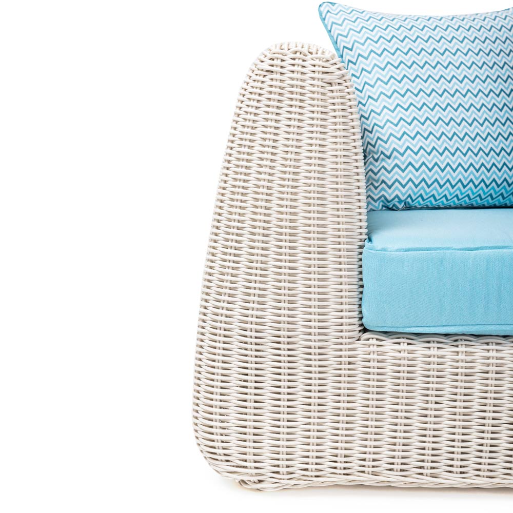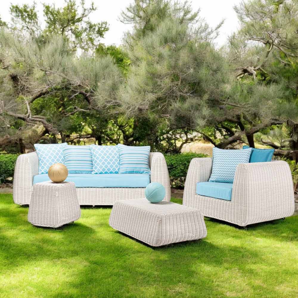 Das Outdoor-Wohnzimmer Charlie ist mit einem Aluminiumrahmen für alle seine Komponenten und manuellem Weben von den besten Handwerkern in der in Polyrattan Faser Marke Rehau von höchster Qualität durchgeführt. Es zeichnet sich durch die verjüngte Form der Armlehnen und die leicht abgerundete Linie. Die Sitz- und Rückenkissen sind inklusive und aus Outdoor-Stoff in verschiedenen Mustern in Blautönen.