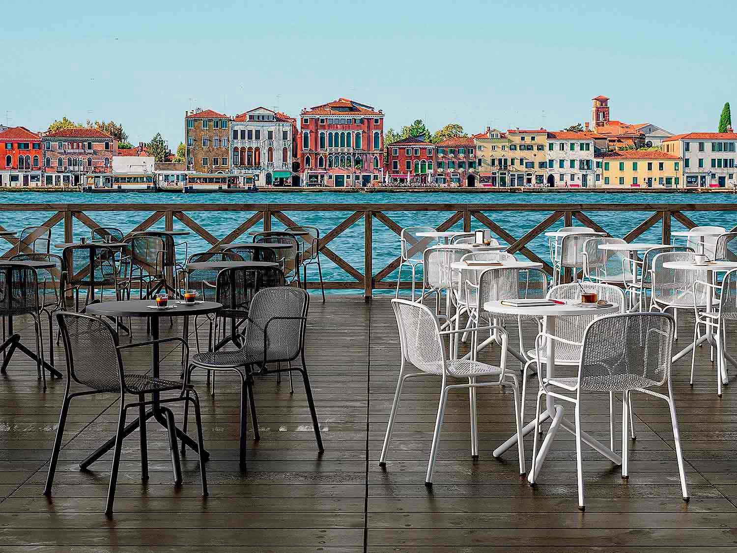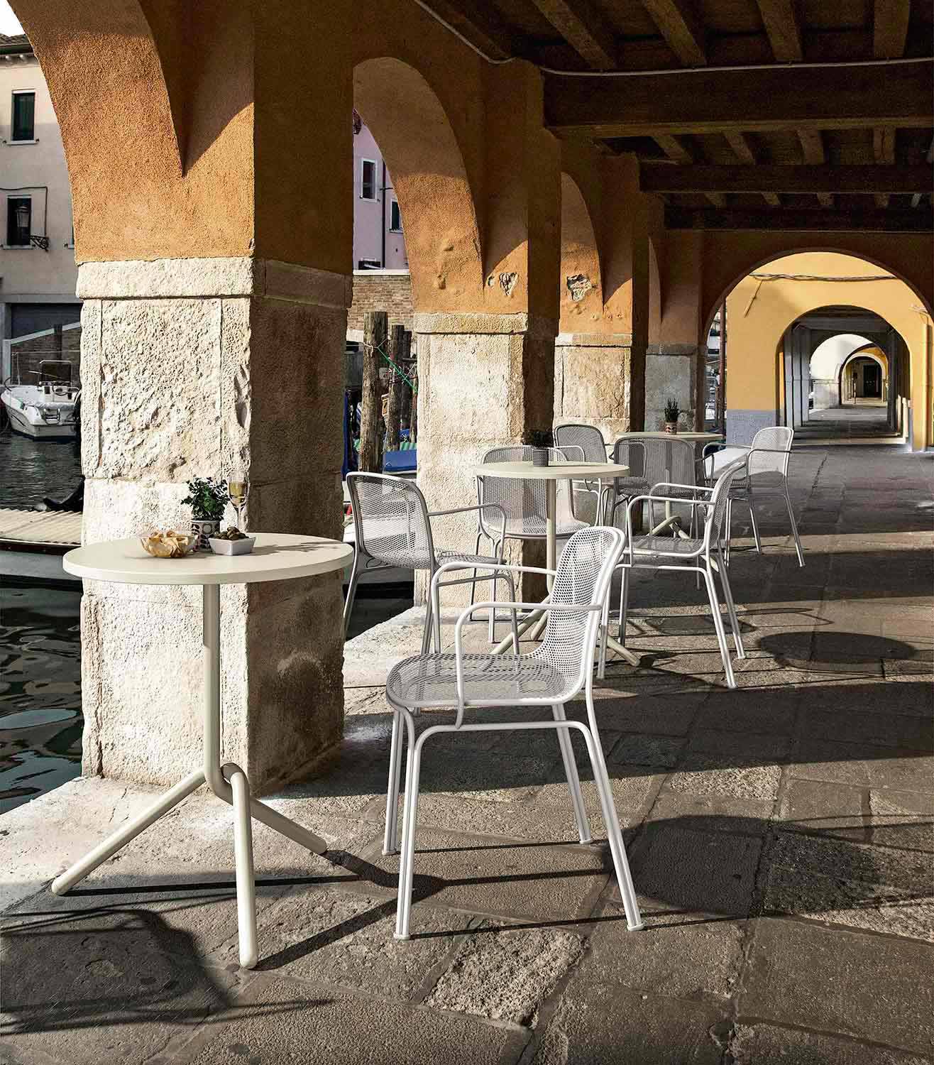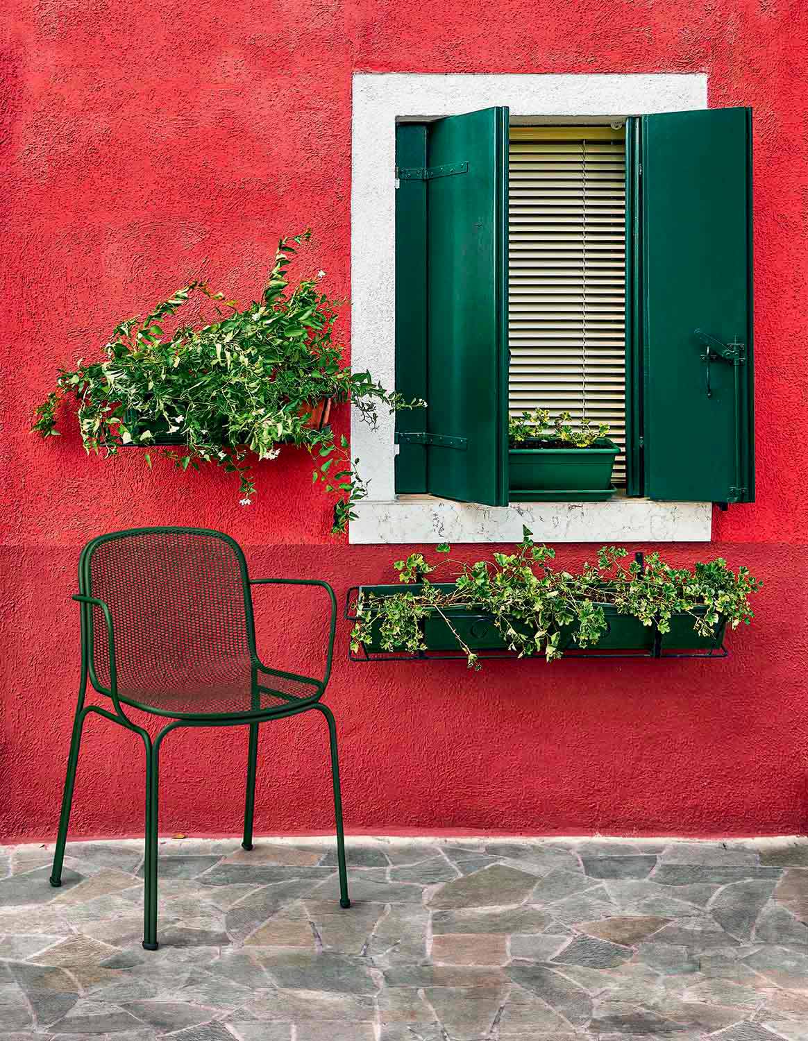 Verna ist ein wunderbarer Outdoor-Stuhl, der vollständig aus Metall und Drahtgeflecht besteht und traditionelle Linien perfekt mit einem zeitgemäßen Design kombiniert, wodurch der Stuhl dank der vorhandenen Armlehnen solide und bequem wird. Dank des im Vergleich zu den Beinen leicht erhöhten Körpers ist es auch extrem einfach zu handhaben. Verna ist in 5 Farbvarianten erhältlich, die es ermöglichen, jeder Umgebung Persönlichkeit zu verleihen. Es ist ein stapelbarer Stuhl mit maximal 6 Einheiten , mit dem Sie den Raum optimal optimieren können.