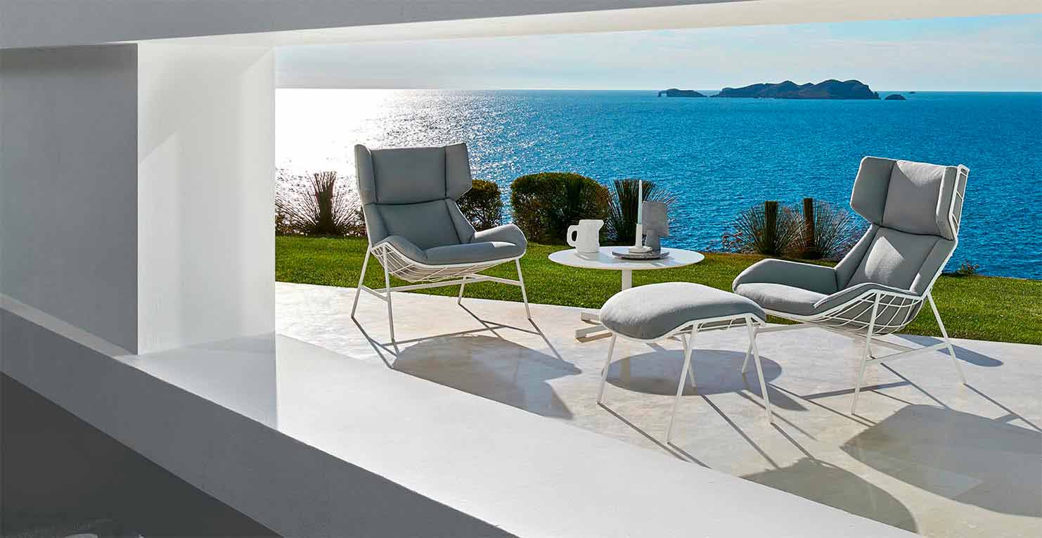 Summer Set ist eine fantastische Outdoor-Pouf/ Fußstütze mit einer tragenden Struktur aus pulverbeschichtetem Stahl in zwei verschiedenen Farben lackiert: weiss oder schwarz. Die Sitz- und Rückenkissen sind mit Stoff bezogen und mit Dryfeel-Gummi gepolstert.