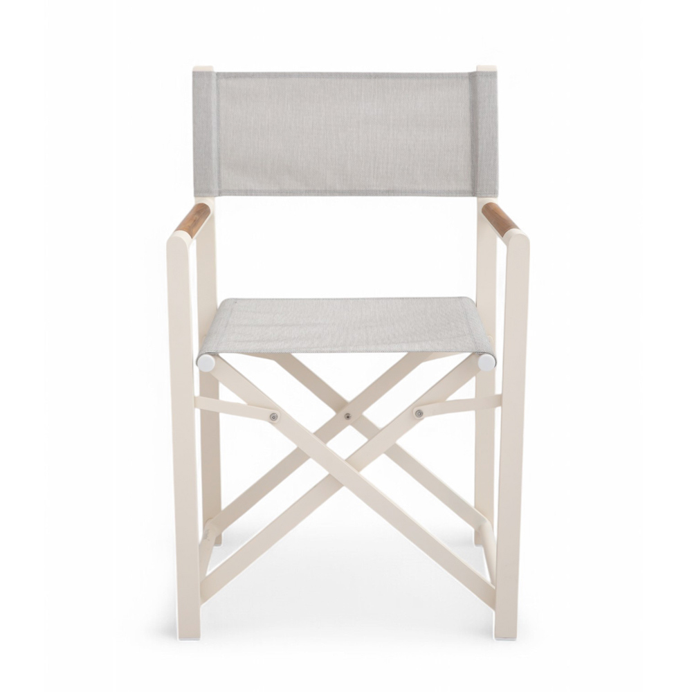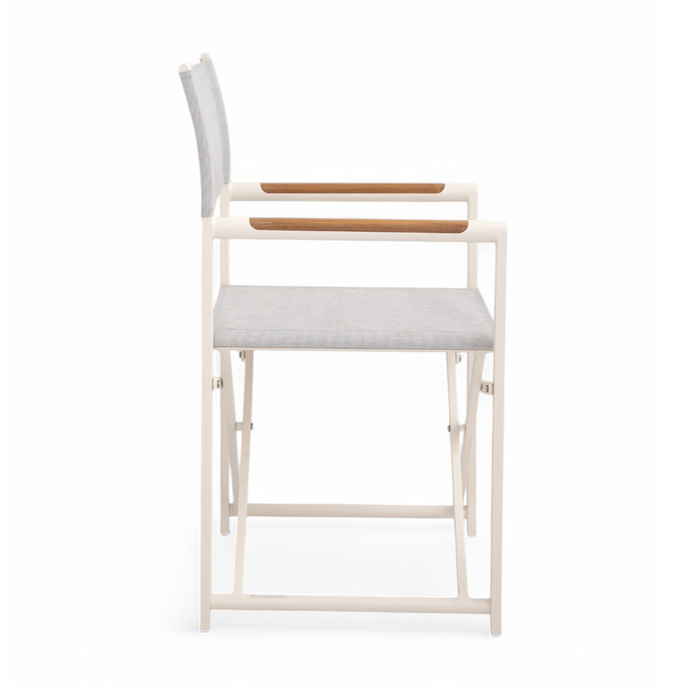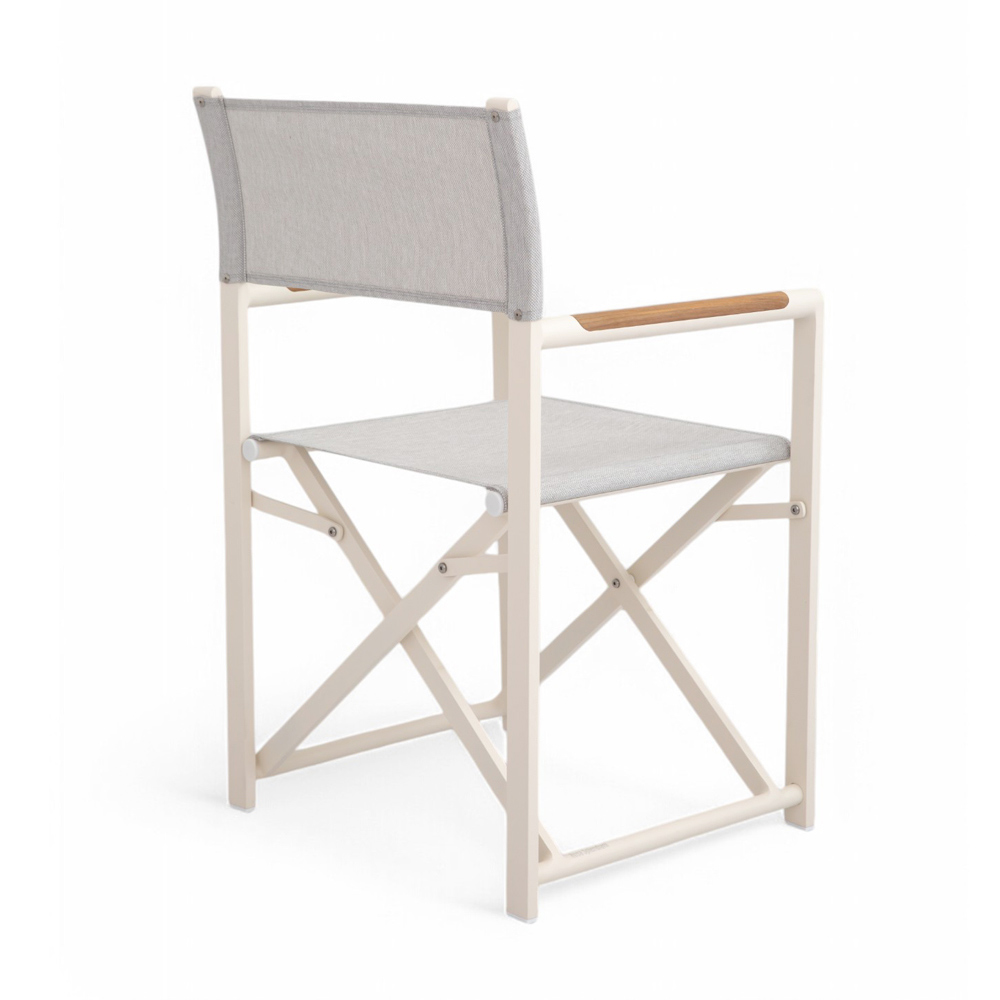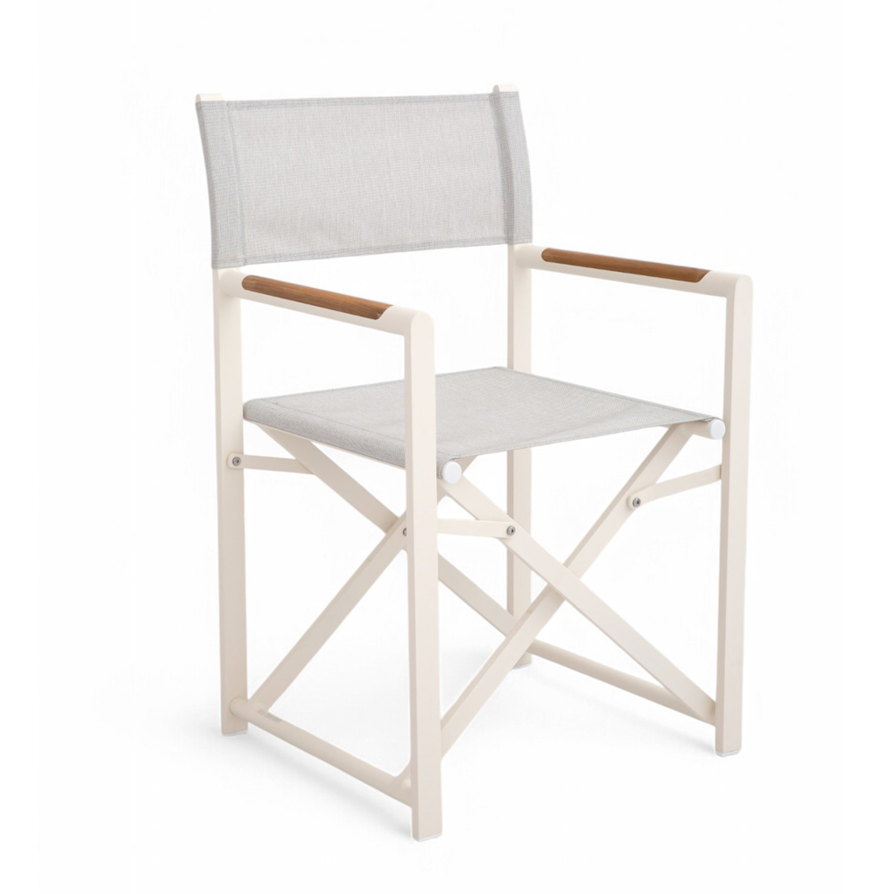 Die Textilene Sitzfläche und Rückenlehne sorgen für maximalen Komfort auch an den heißesten Tagen, während die Naturholzdetails an den Armlehnen einen Hauch von Raffinesse hinzufügen. Das klappbare Design macht diesen Stuhl extrem praktisch und vielseitig, perfekt für Abendessen im Garten oder Momente der Entspannung auf der Terrasse.