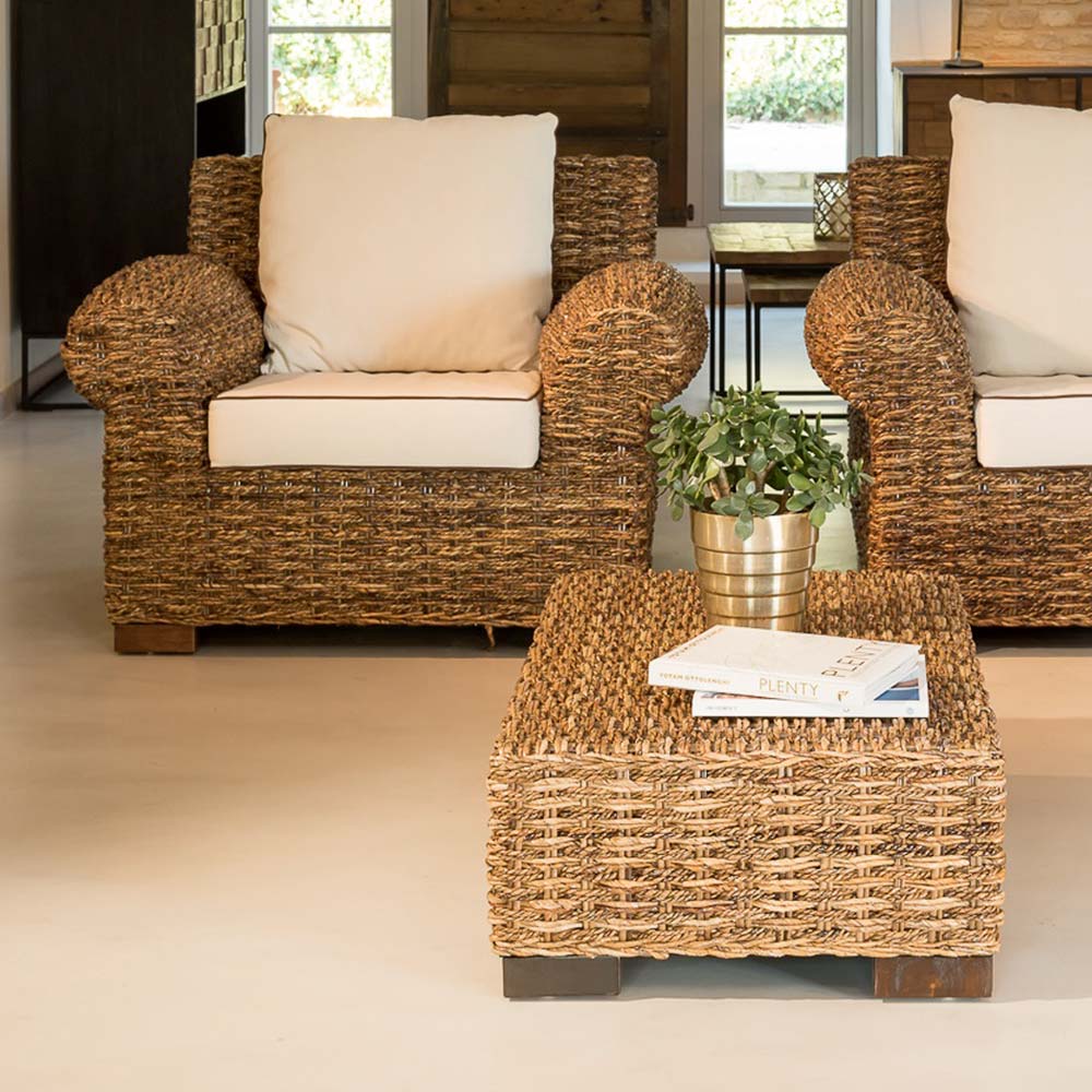 Der Sessel gehört zu einer ganzen Kollektion, die durch die abgerundeten zylindrischen Armlehnen und ein raffiniertes dichtes Geflecht aus natürlicherAbaca-Faser, die aus dem Bananenbaum gewonnen wird, einzigartig ist. Die Sitze sind groß und mit bequemen Kissen ausgestattet. Die Produkte dieser Kollektion eignen sich für die Einrichtung von überdachten Außenbereichen wie Veranden, Balkone, Terrassen, Verandas und Pavillons und beleben die Umgebungen mit einzigartiger Wärme und Stil.