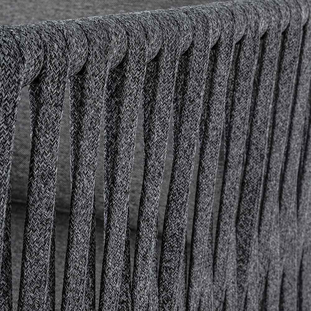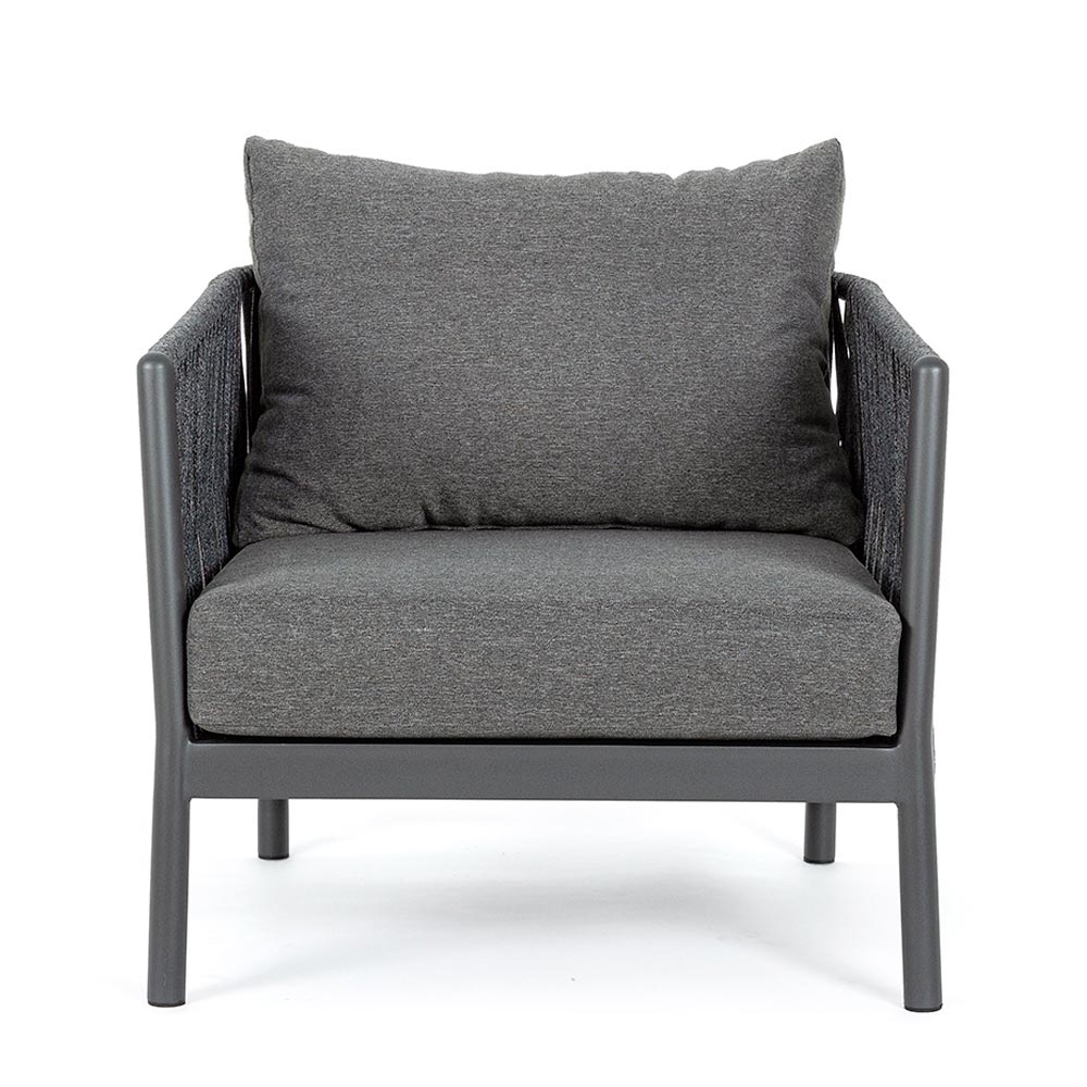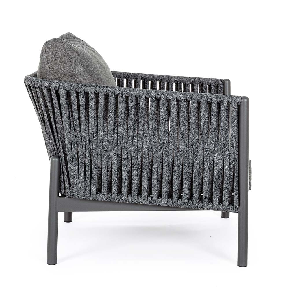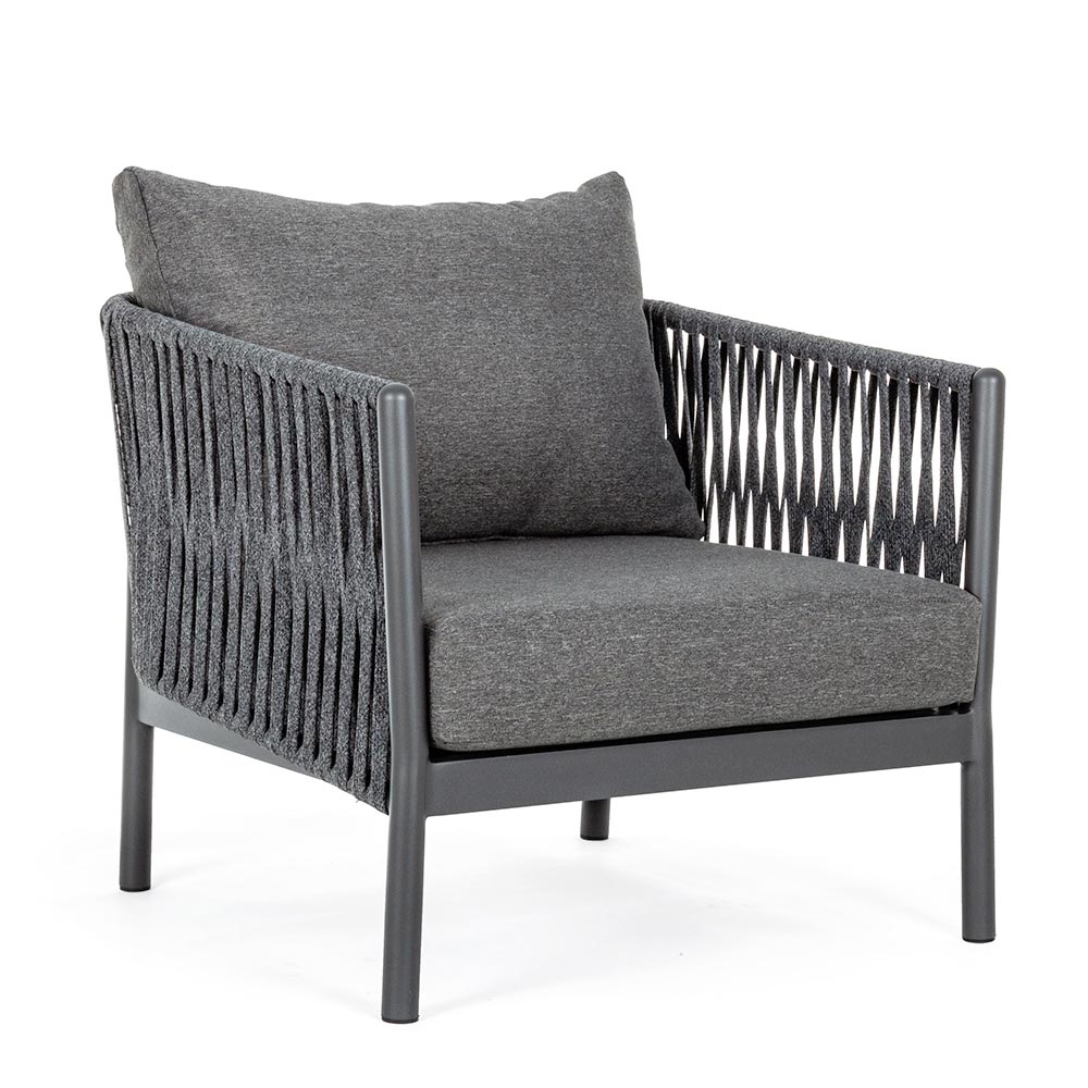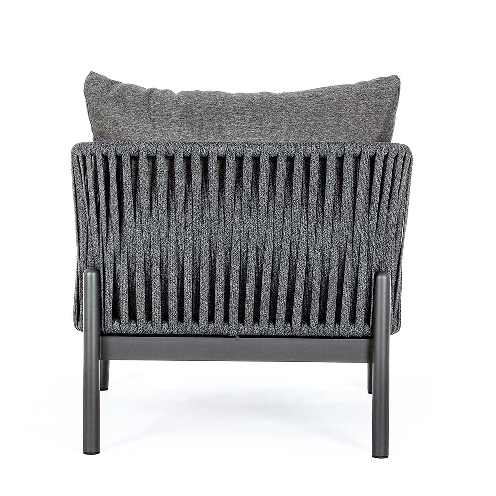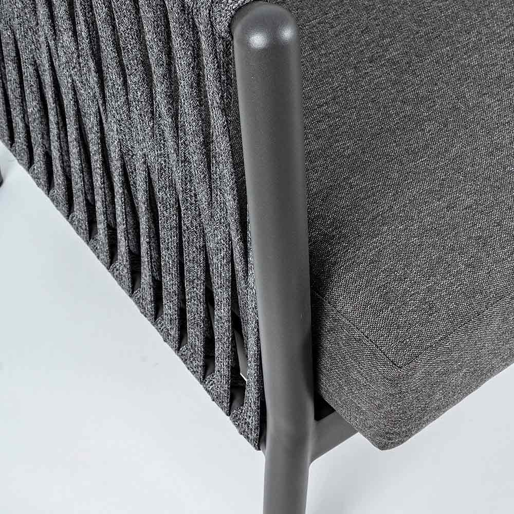 Outdoor-Sessel mit Aluminiumstruktur und seilgewebter Rückenlehne.