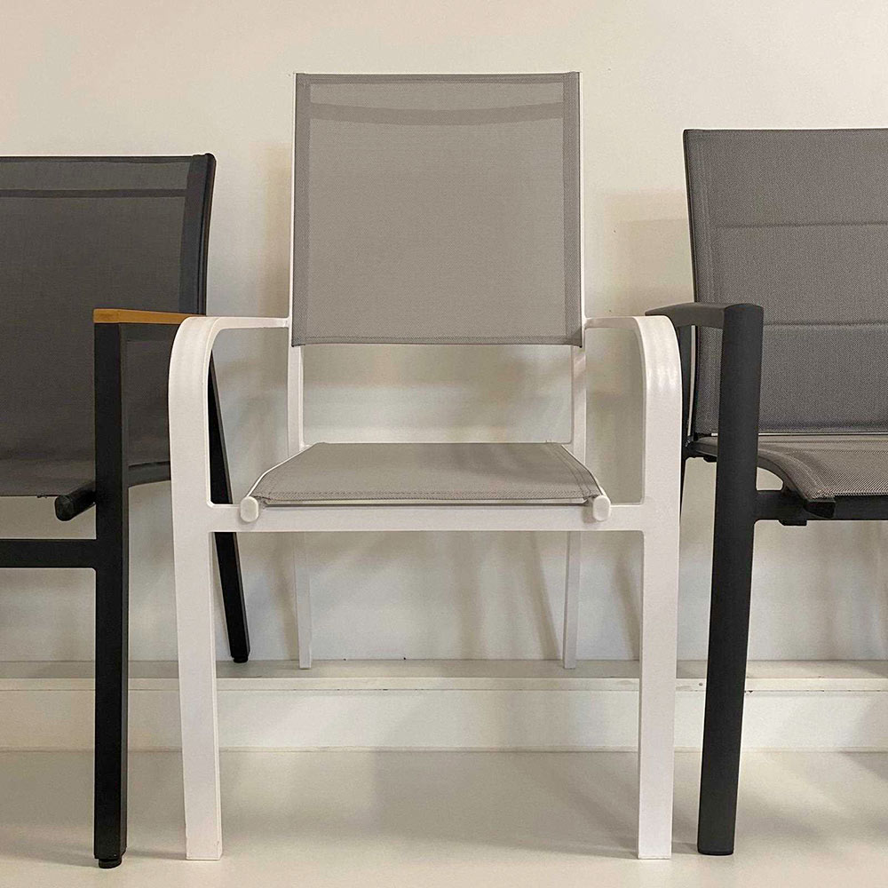 Gartensessel mit weißem pulverbeschichtetem Aluminiumgestell, Sitz und Rückenlehne aus hellgrauem Textilene.