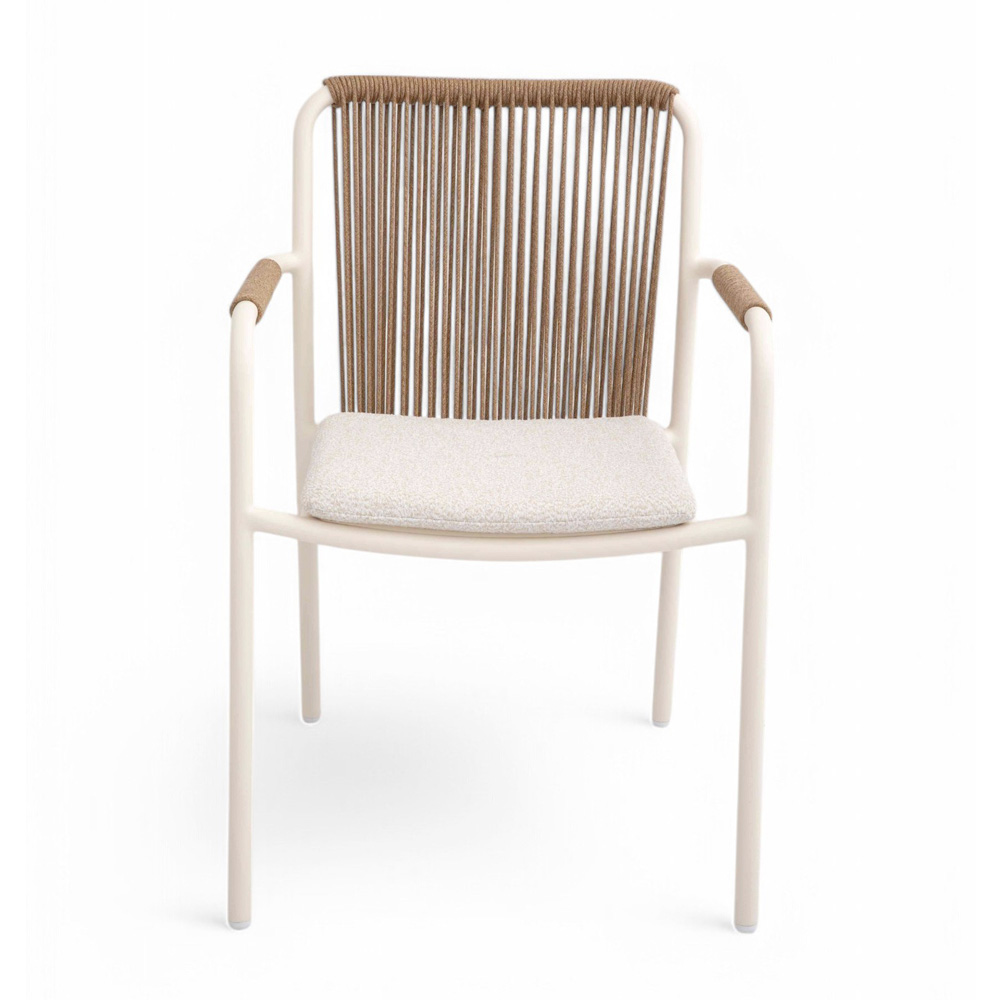 Das weiche Kissen, bezogen mit einem strapazierfähigen und leicht zu reinigenden Stoff, sorgt für maximalen Komfort für entspannte Momente im Freien. Die seilbespannten Armlehnen sind ein raffiniertes Detail und bieten einen bequemen Halt.