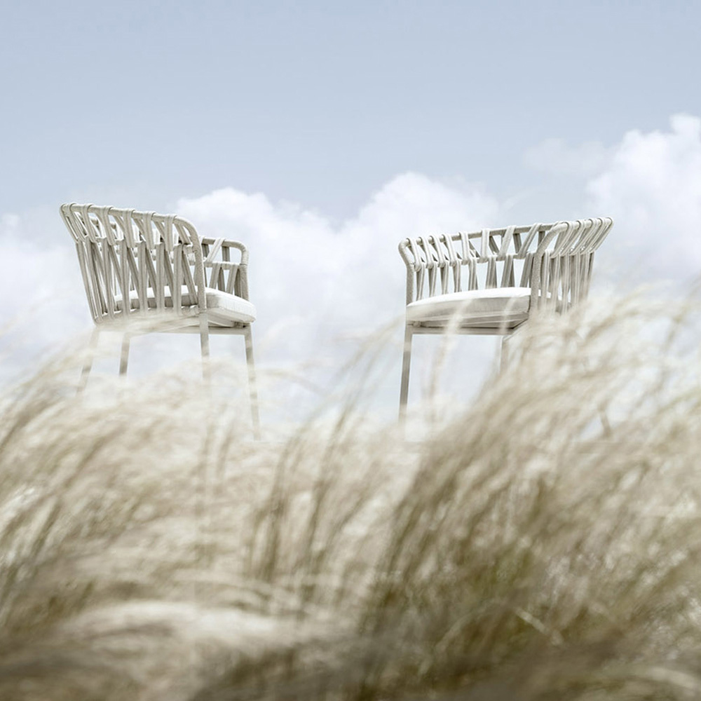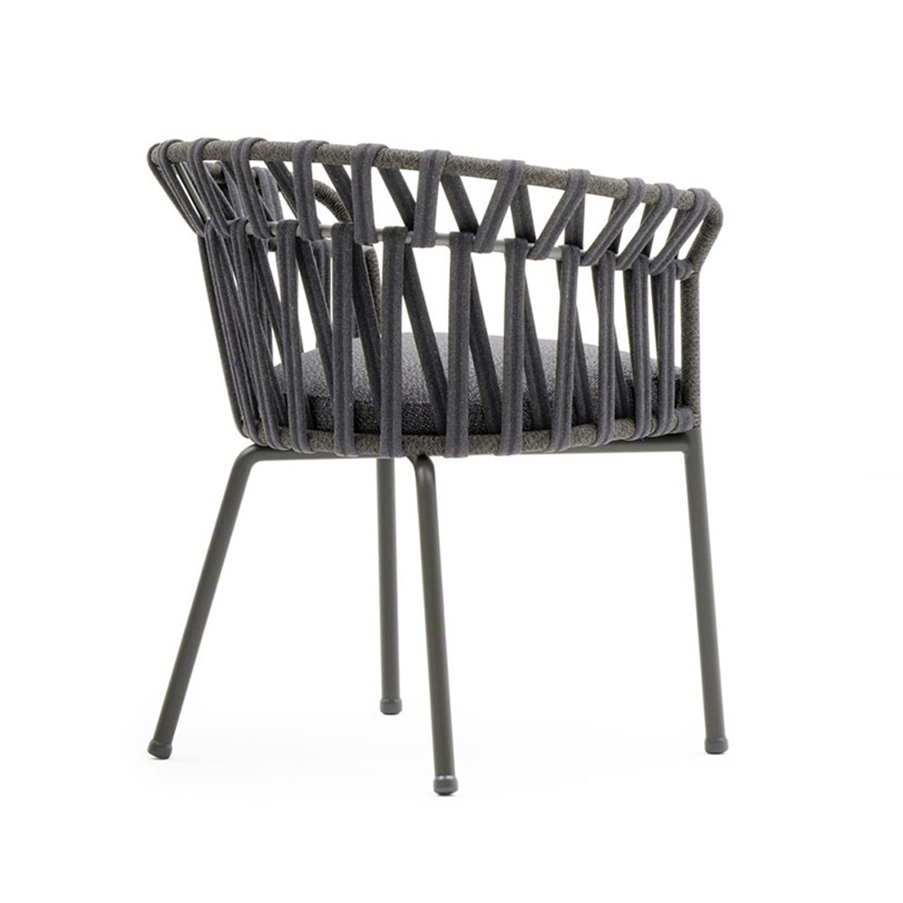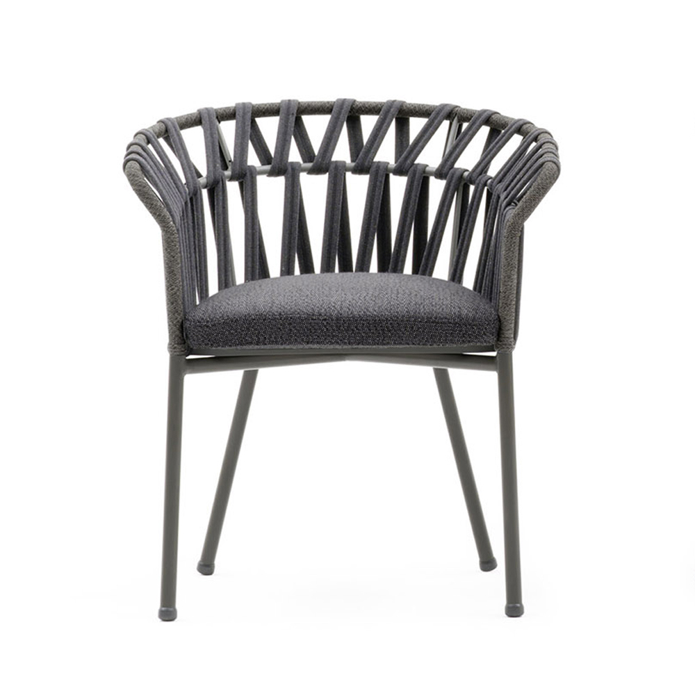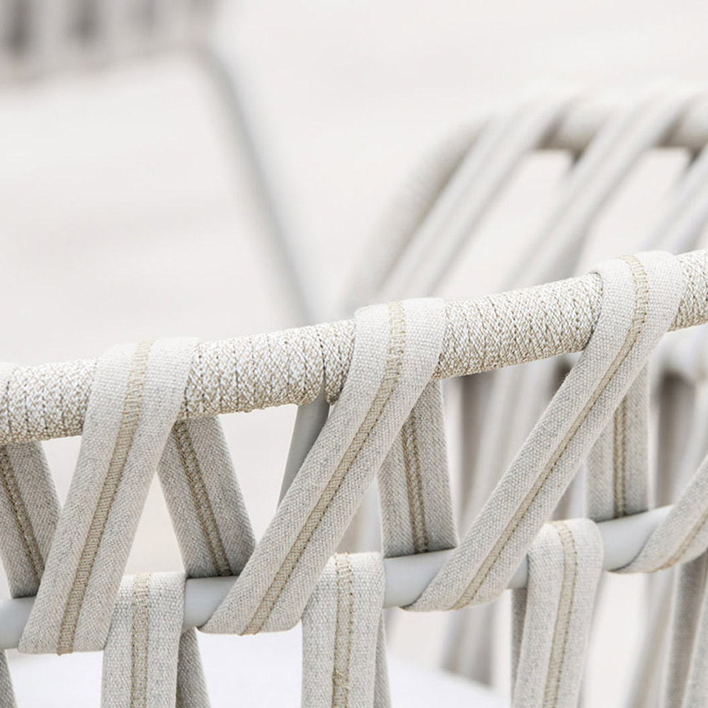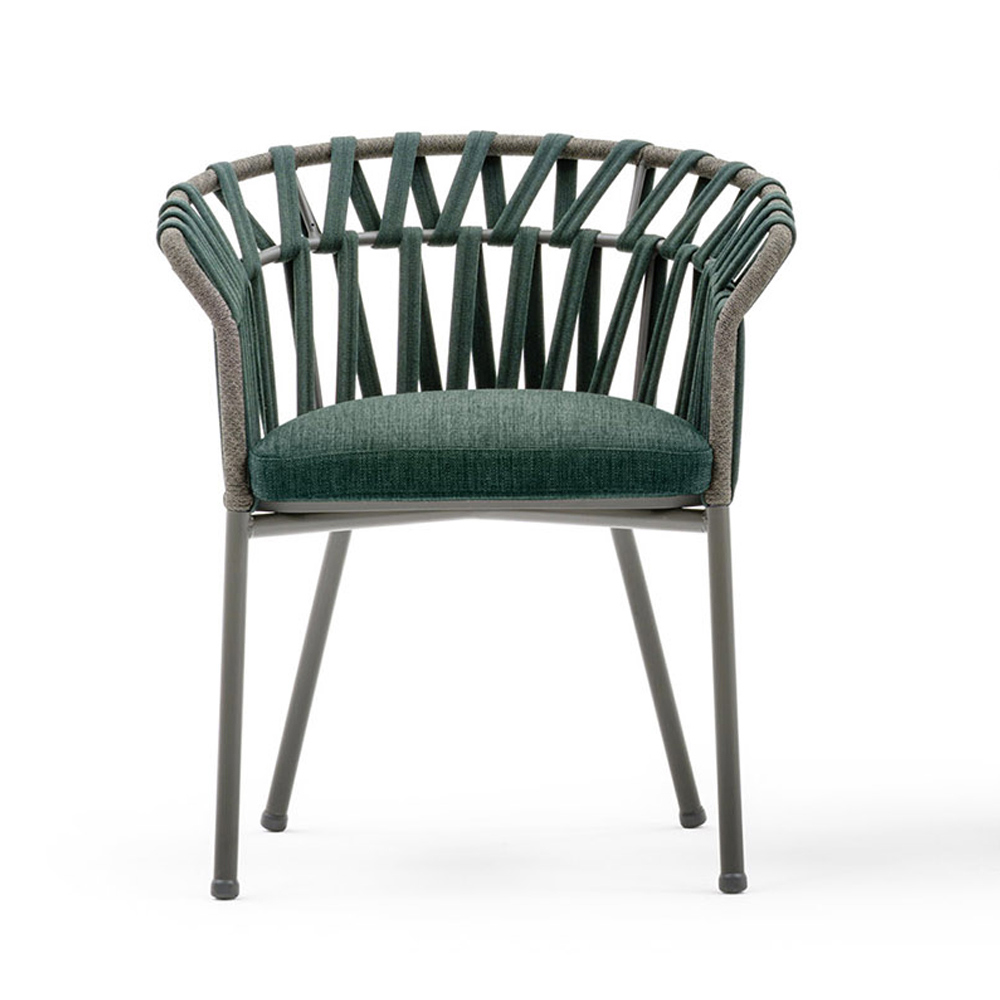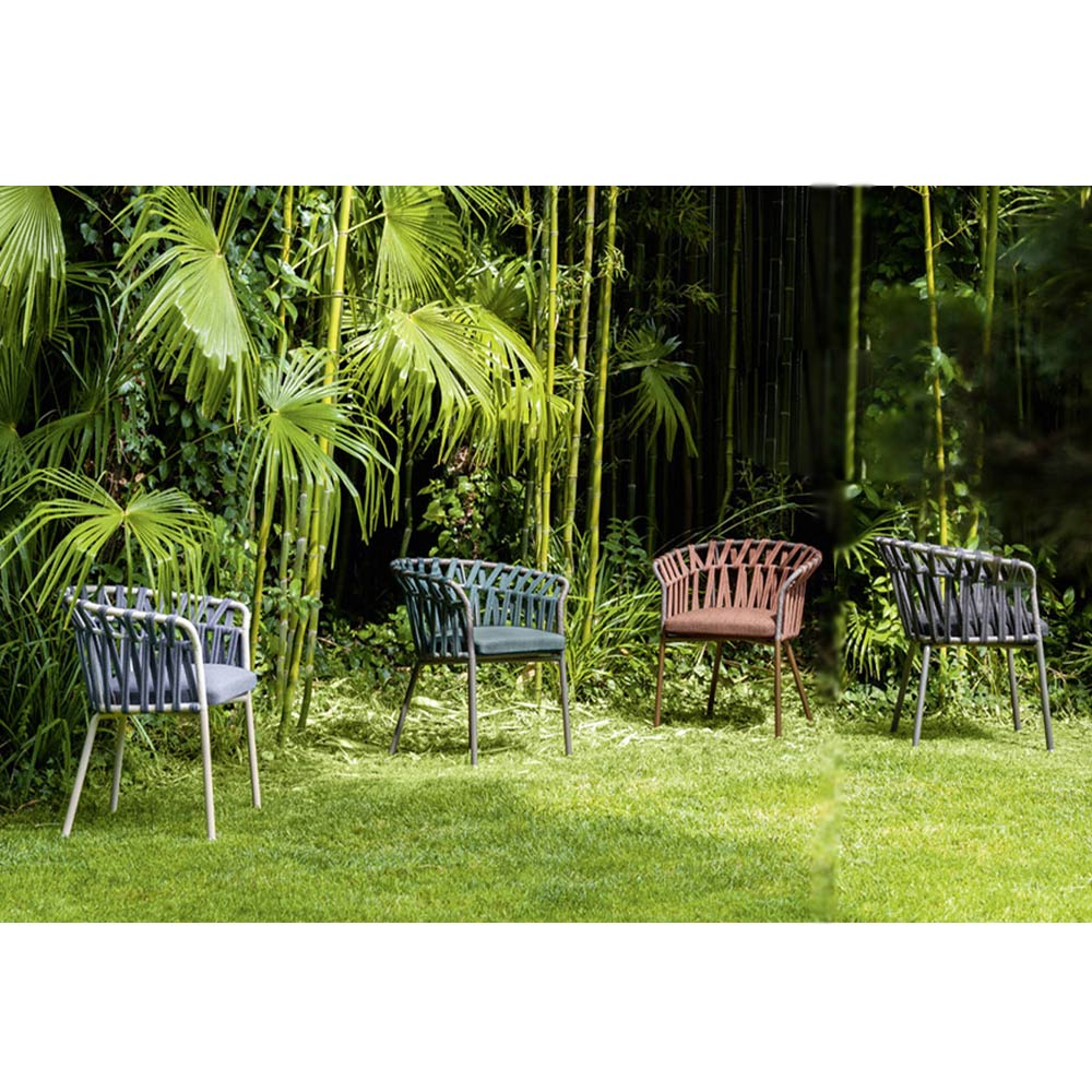 Outdoor-Sessel mit Basis aus pulverbeschichtetem Aluminium , abnehmbarer Sitz aus abnehmbarem Stoff und Rückenlehne aus Aluminium , angereichert mit einer Verflechtung aus handgefertigten Acrylgewebeschnüren . Sein Design ist von den eleganten und leichten Formen einer Blumenkrone inspiriert und wird durch das Gewebe einzigartig, das einem bestimmten geometrischen Muster folgt, das perfekt zu den zarten und einhüllenden Formen der Struktur passt, die willkommen und entspannend sind. Was entsteht, ist eine frische und innovative Einrichtungslösung, die durch wunderbar raffinierte Nuancen bereichert wird, dank derer sich die Natürlichkeit des Außenbereichs in zeitgenössische Eleganz verwandelt.