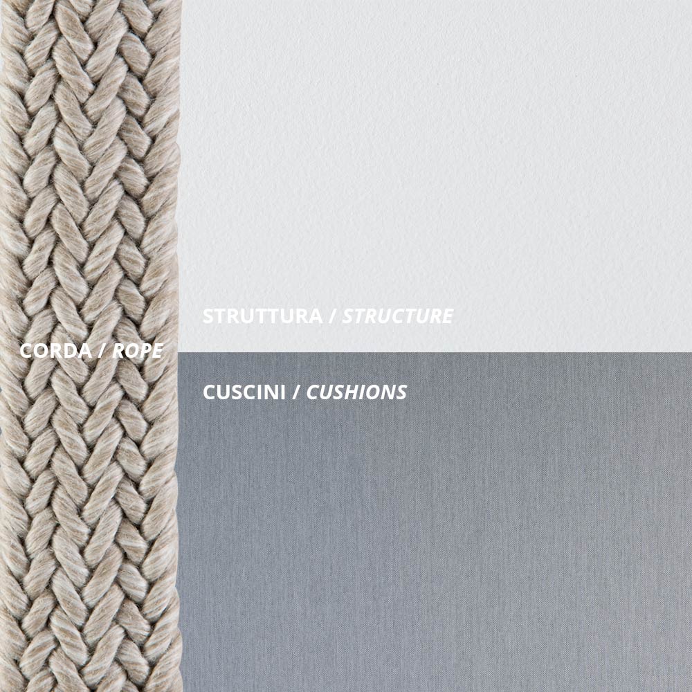 - Rahmen: geprägtes Weiß + Seil: Schlamm + Kissen: Grau