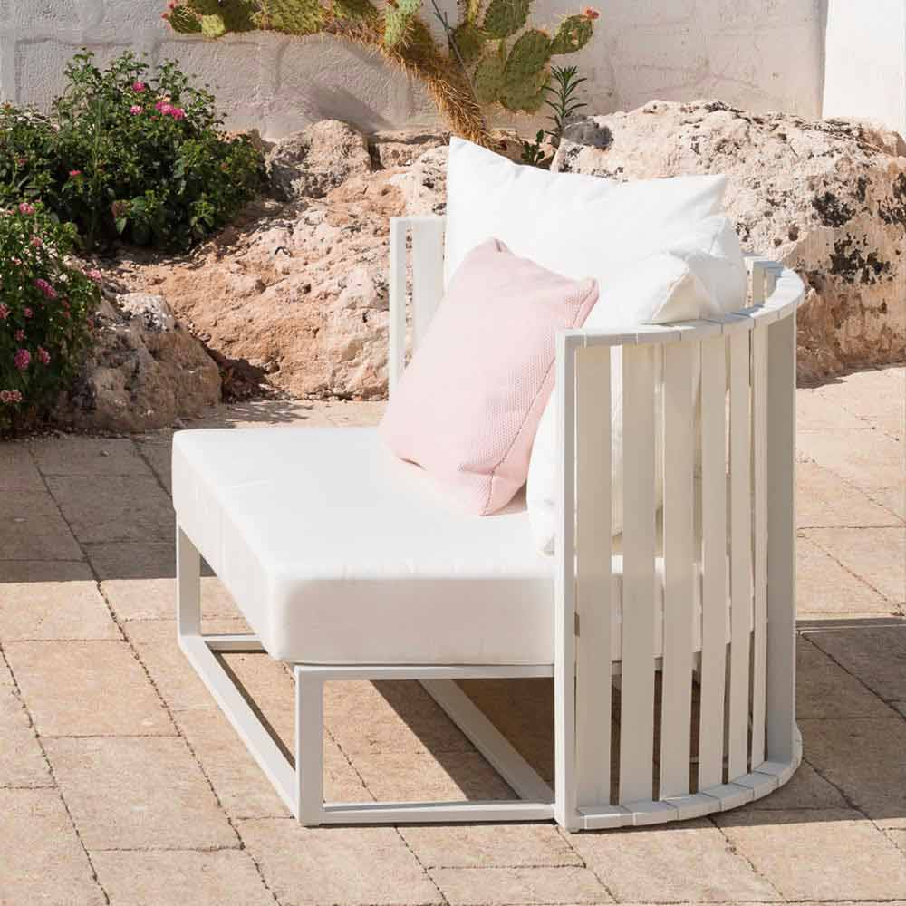 Der epoxidpulverbeschichtete Aluminiumrahmen (mit stoß- und kratzfesten Eigenschaften) ist in den Farben Eis, Taubengrau und Gold in Kombination mit den freiliegenden Polyesterbändern erhältlich. Die Halbkreisstruktur steht für Eleganz und Luxus , für einen formellen und raffinierten Look mit Kissen aus weißem Stoff.