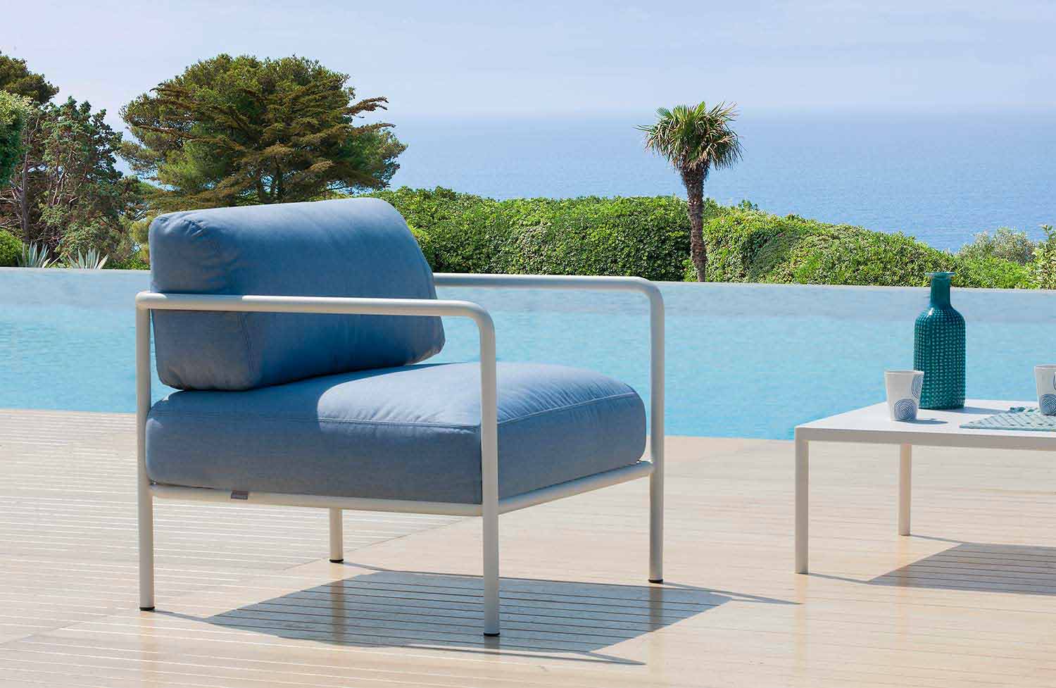 In Italien aus ausgewählten Rohstoffen hergestellter Outdoor-Sessel, um dem Kunden ein Endprodukt zu garantieren, das sich durch hervorragende Haltbarkeit und Beständigkeit gegen alle Witterungseinflüsse sowie Flecken, Schimmel und UV-Strahlen auszeichnet. Die Struktur und die Armlehnen bestehen aus pulverbeschichtetem, verzinktem Eisen mit duroplastischen Pulvern, während Sitz- und Rückenkissen aus 100 % gefärbtem Acrylgewebe bestehen. Die Kombination dieser beiden Materialien verleiht dem Produkt Stabilität, ohne den optischen und dekorativen Aspekt zu vernachlässigen. Ideal für die Einrichtung von Außenbereichen, die Eleganz und Persönlichkeit erfordern, dank der minimalistischen Linien, die es zu einem Objekt mit einzigartigem Design machen.