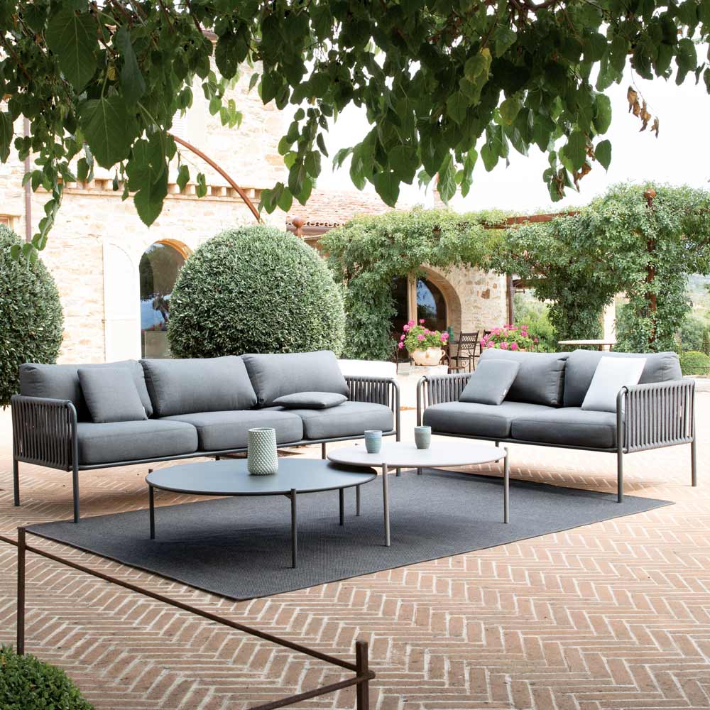 Gartensofa aus Stahl und Seil in verschiedenen Größen mit Kissen, Made in Italy.