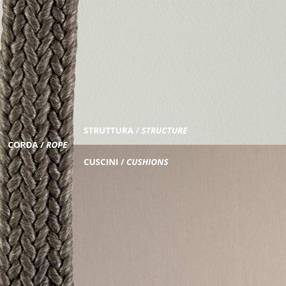 - Rahmen: geprägtes Weiß + Seil: Schlamm + Kissen: Grau