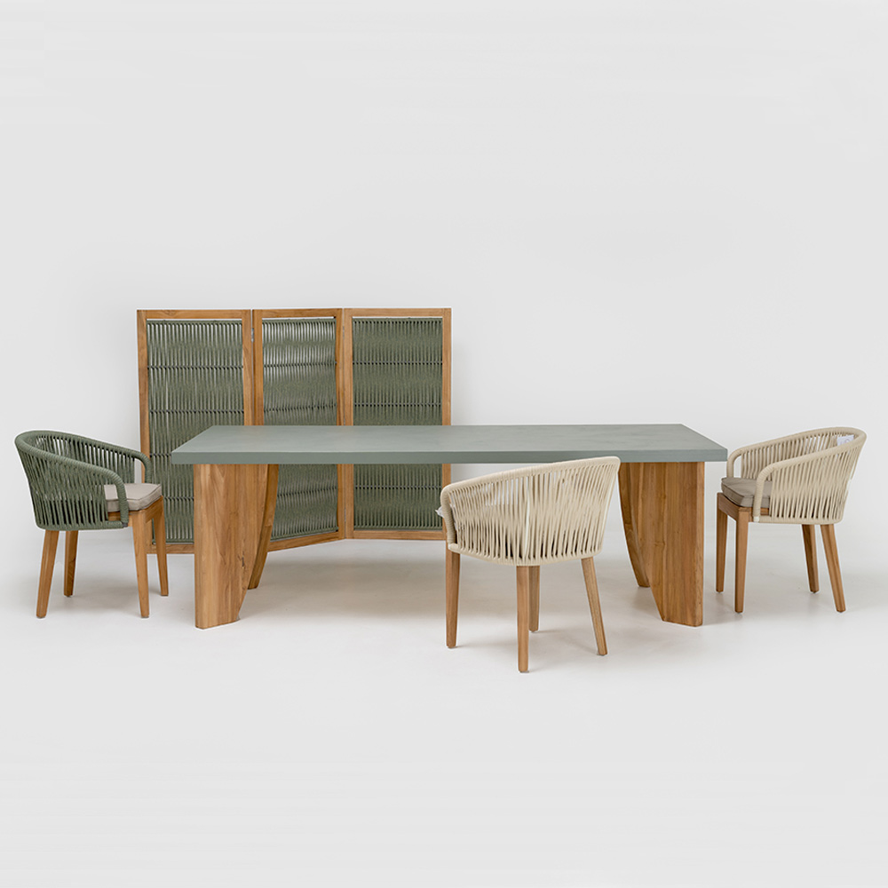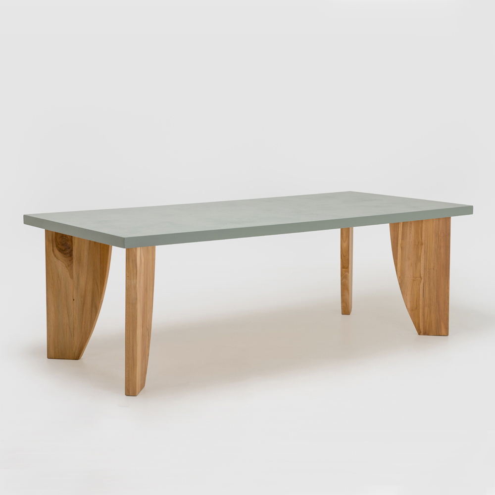 Esstisch mit Okumé-Marinesperrholzplatte (Dicke 25 mm) mit einer äußeren Mikrozementoberfläche (3 mm dick), einer 50 mm hohen Randkante und einem 60 mm starken Sockel aus natürlichem massivem Teakholz (45°-Befestigung), vollständig in Italien hergestellt. Die Oberfläche ist auffällig, da sie die Textur hervorhebt und sich dennoch edel anfühlt.