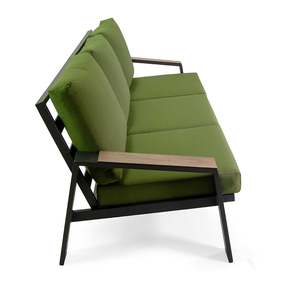 1 3-Sitzer Sofa : Gestell aus rostfreiem Aluminium, pulverbeschichtet in anthrazit, Kissen aus wasserabweisendem Olefin 203g/m², grün, Dicke 12 cm und Einsätze in den Armlehnen aus HPL, Dicke 6 mm.