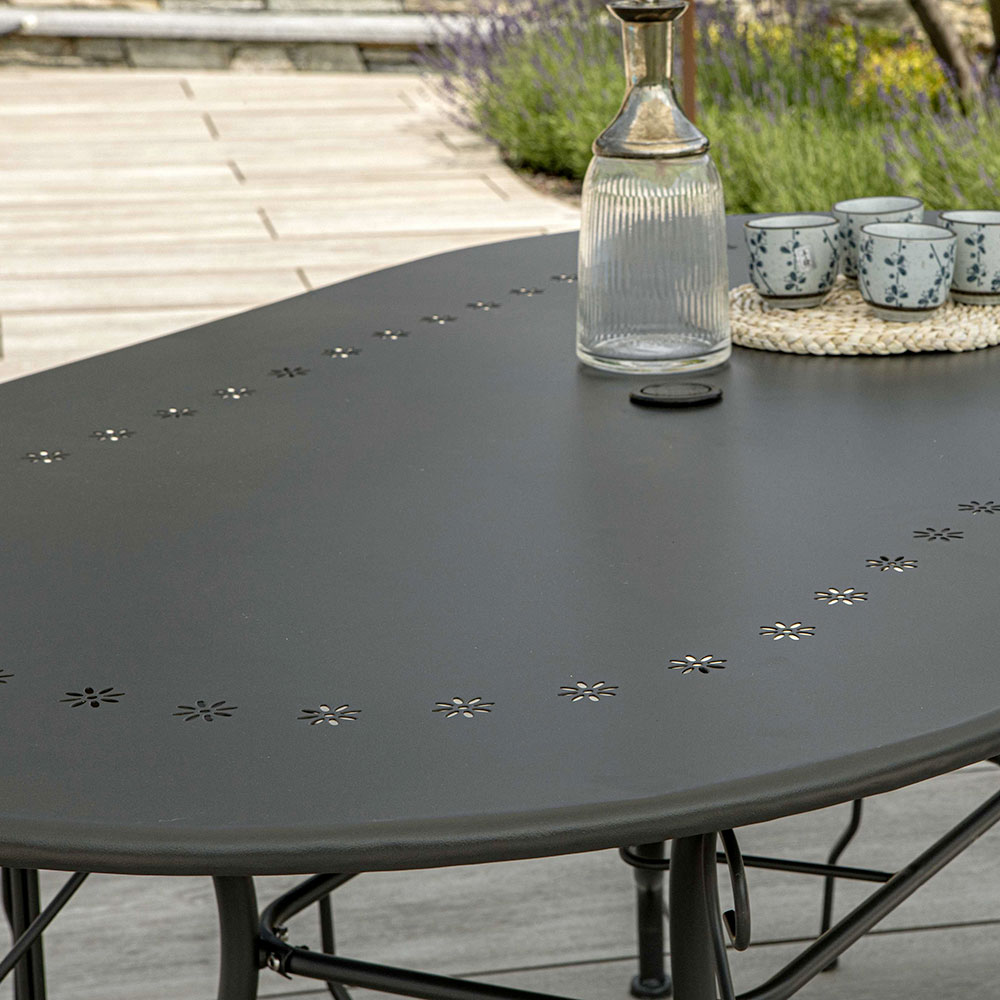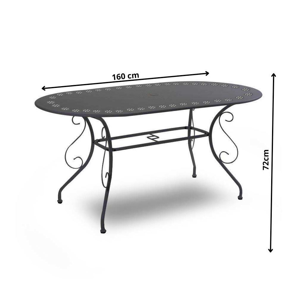 Dieser ovale Metalltisch ist die perfekte Wahl für alle, die Funktionalität und Stil verbinden möchten. Mit seinem stabilen Rahmen und den eleganten, geschwungenen Beinen bietet er einen idealen Treffpunkt für gesellige Momente im Freien.