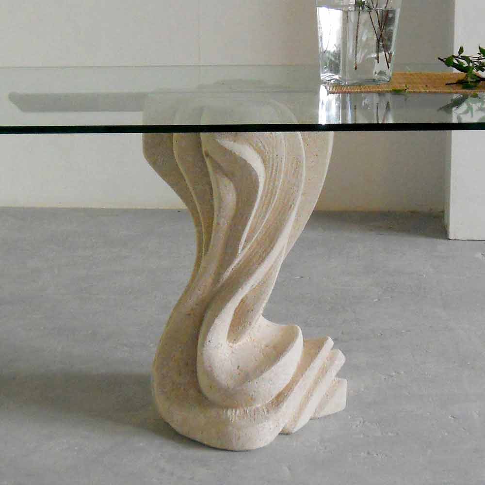 Die Basis ist aus Naturstein aus Vicenza hergestellt und wird von Hand bearbeitet. Die Tischplatte besteht aus Kristall float mit einer Dicke von 15 mm und ist an dem Stein mit einem Flansch befestigt.