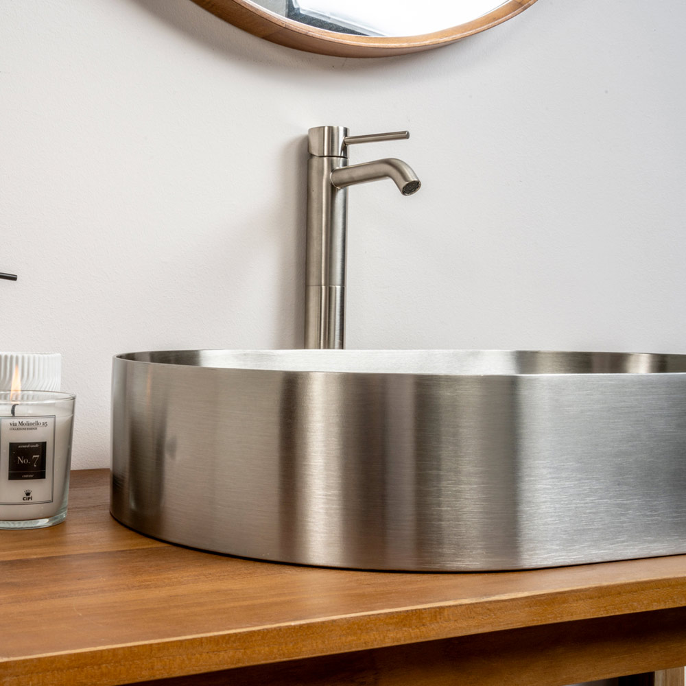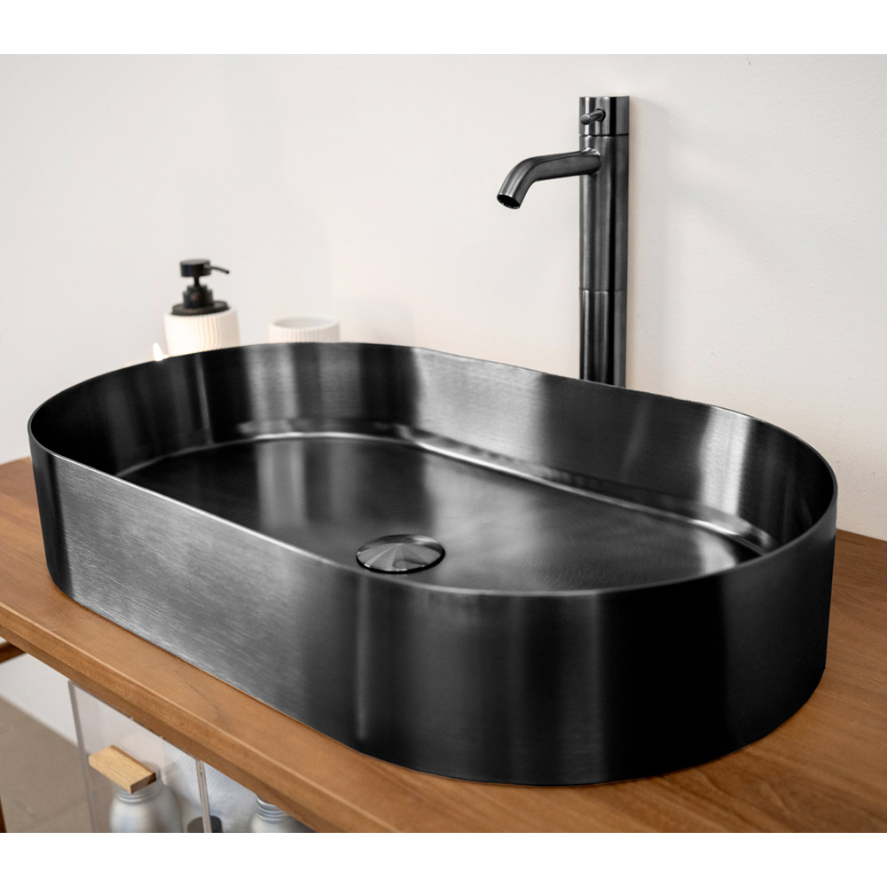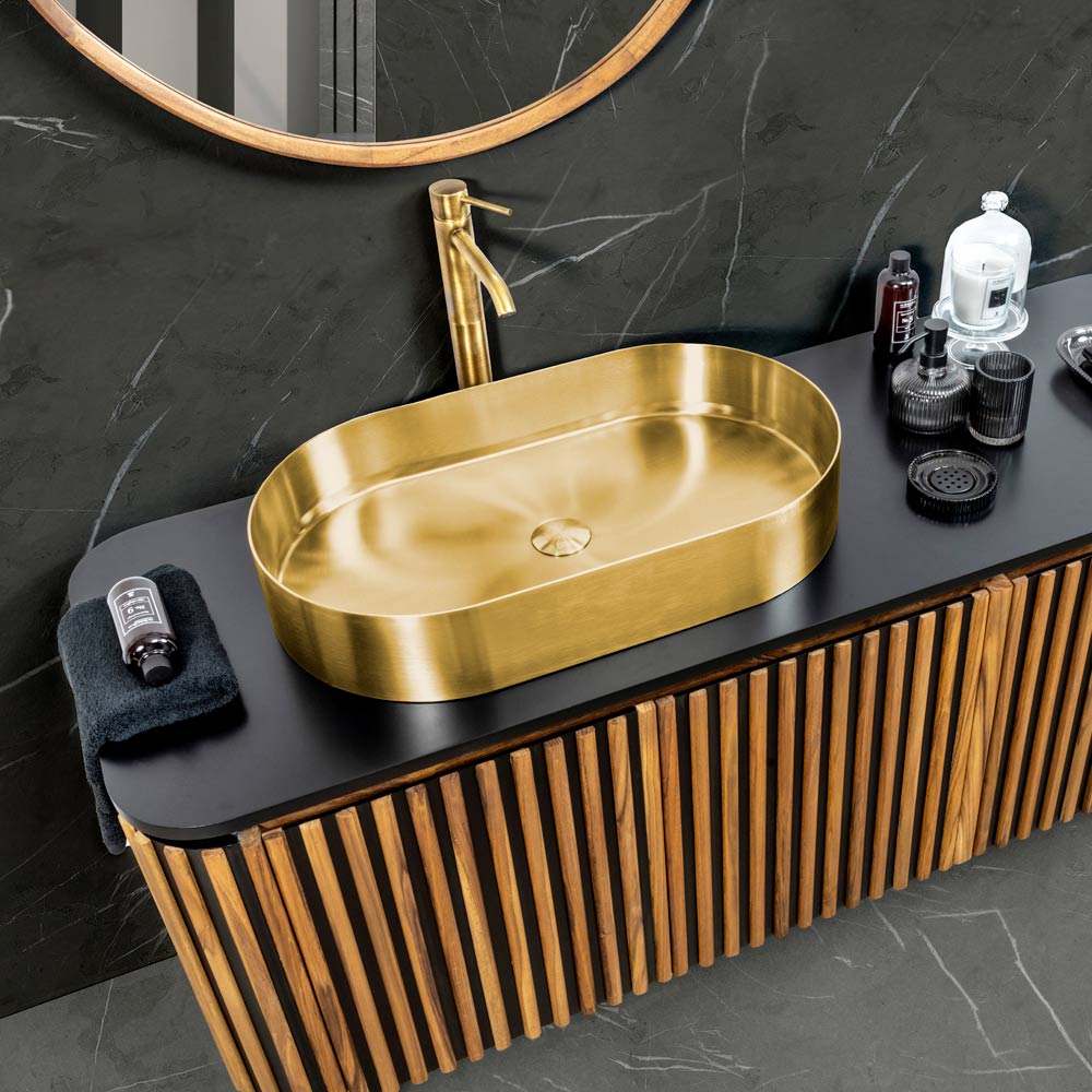 Das ovale Aufsatzwaschbecken aus 3 mm starkem Edelstahl SUS 304 ist ein Juwel an Design und Funktionalität. Es ist aus einem einzigen Metallblech gefertigt und bietet eine klare, moderne Ästhetik. Die Endbearbeitung der PVD+Nano-Beschichtung in Kombination mit sorgfältigem Bürsten verleiht dem Objekt ein attraktives und fast rätselhaftes Aussehen und verbessert den Glanz sowie die Widerstandsfähigkeit gegen Flecken und Kratzer. Das Design zeichnet sich durch ausgewogene Formen und ideale Proportionen aus in drei Ausführungen , die sich elegant an jede Umgebung anpassen. Darüber hinaus machen raffinierte Details wie die mitgelieferte passende Ablaufabdeckung und der völlige Verzicht auf sichtbare Schweißnähte dieses Waschbecken zu einem wahren Meisterwerk der Handwerkskunst und des Designs und machen es zu einem herausragenden Stück für Badezimmer mit luxuriöser und zeitgemäßer Ausstrahlung.