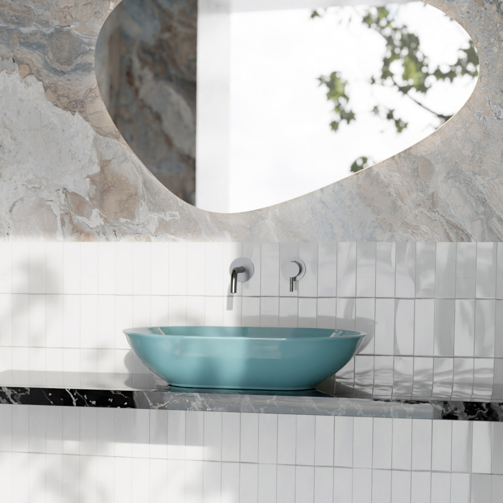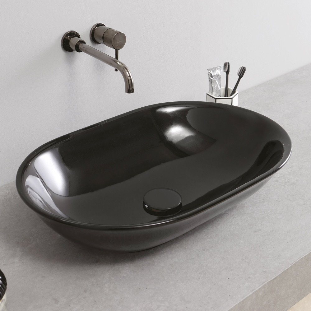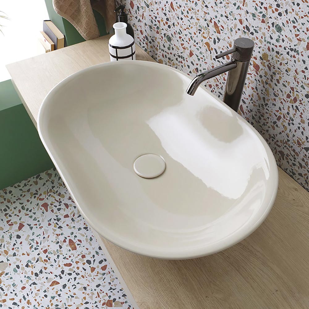 Aufsatzwaschbecken mit ovaler Form aus farbiger Keramik mit glänzender Oberfläche, hergestellt zu 100 % in handwerklicher Produktion Made in Italy . Weiche und harmonische Linien prägen das Design dieses edlen Waschbeckens mit einer schlichten und vielseitigen Ästhetik . Tatsächlich passt sich seine Form jedem modernen stilistischen Kontext perfekt an und bringt eine exklusive Note mit , die die Einrichtung des Badezimmerbereichs auf einzigartige und avantgardistische Weise vervollständigen kann. Um die Ästhetik des Waschbeckens zu bereichern, werden die wunderbaren Farben vorgeschlagen, die trotz eines nüchternen und eleganten Stils ein raffiniertes Ergebnis gewährleisten.