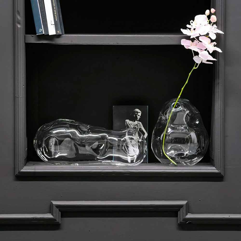 Originelles Paar dekorative Vasen made in Italy aus transparentem mundgeblasenem Glas mit exzentrischem Design. Originalität, Kreativität und Eleganz sind die besonderen Merkmale dieser Komposition moderner Vasen, die sich zu einer äußerst ungewöhnlichen und fantasievollen Einrichtungslösung zusammenfügen . Die Leidenschaft und Erfahrung der Meister des mundgeblasenen Glases ermöglichen es, ein echtes Kunstwerk zu schaffen und seinen Wert noch mehr zu steigern, ist die Tatsache, dass jedes Stück einzigartig und unwiederholbar ist, da es durch kleine Unterschiede gekennzeichnet ist, die es unterstreichen. der Wert. Das Ergebnis ist somit eine Design-Ergänzung, die dank ihrer exklusiven Persönlichkeit und ihres originellen Charakters alle Aufmerksamkeit auf sich zieht.