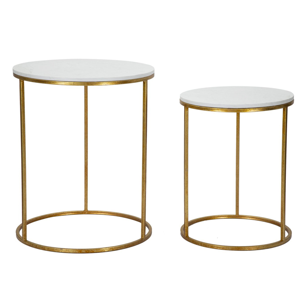 Couchtische mit goldfarbener Eisenstruktur und runder Platte aus weißem Harz mit Marmoreffekt . Zwei Ergänzungen mit einem einfachen und vielseitigen Design, dasentworfen wurde, um Wohnzimmer im eleganten Stil mit Charakter und Persönlichkeit für ein exklusives und raffiniertes Ergebnis zu vervollständigen. Die Wesentlichkeit der Formen repräsentiert ihre wahre Stärke, prägt die gesamte Ästhetik und steigert ihren Wert zusammen mit der raffinierten Glasplatte, die ihre edle Optik unterstreicht.