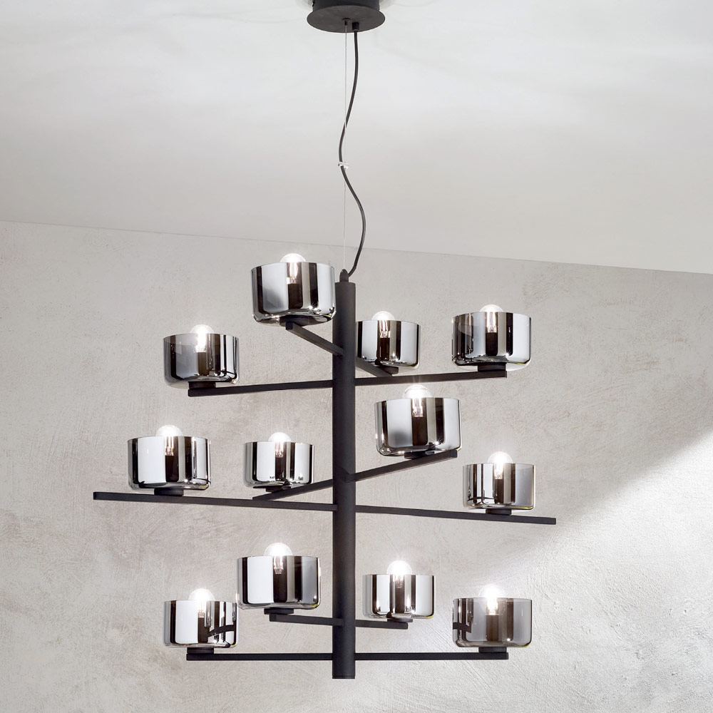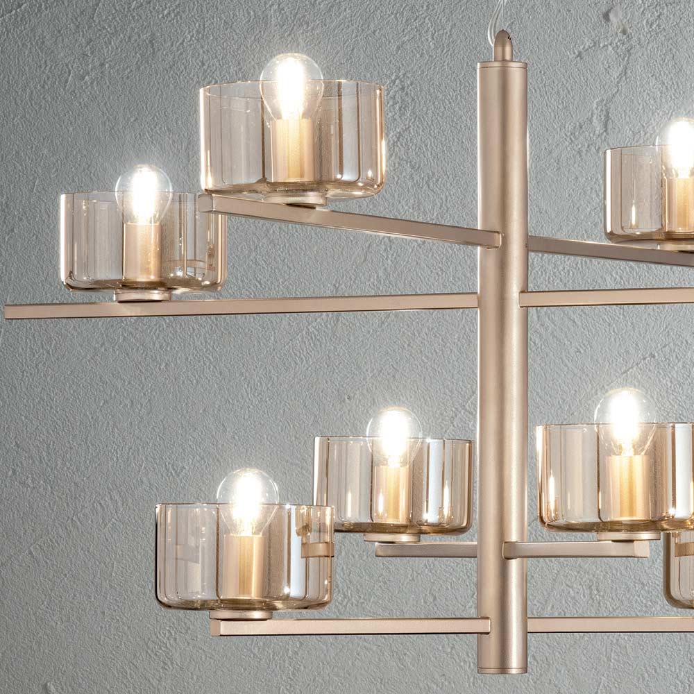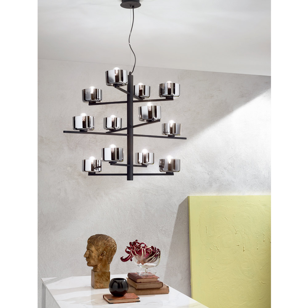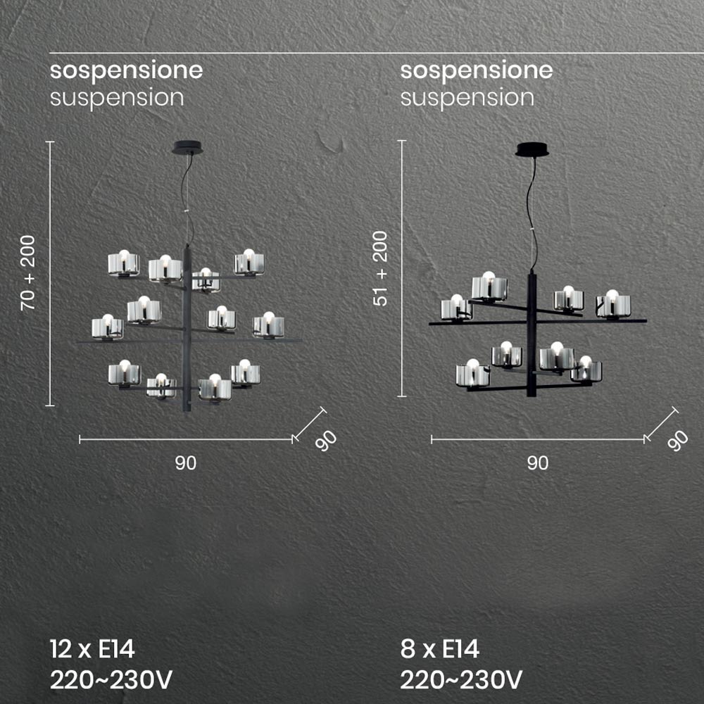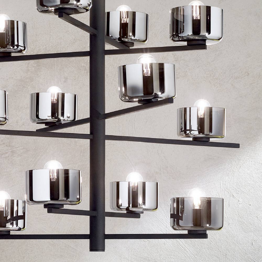 Pendelleuchte mit Metallstruktur und Diffusoren aus mundgeblasenem Glas komplett mit längenverstellbaren Kabeln. Ein Designobjekt mit einer imposanten Ästhetik , das durch seine starke szenografische Wirkung und die wunderbare Kombination der gewählten Materialien und Oberflächen die Umgebung ausfüllt. Die Verwendung von mundgeblasenem Glas unterstreicht den raffinierten Stil der Leuchte und ermöglicht eine perfekte diffuse Beleuchtung , um in Esszimmer, Wohnzimmer oder Schlafbereich mit zeitgemäßem Geschmack eine warme und einladende Atmosphäre zu schaffen.