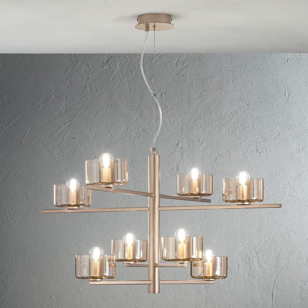 Pendelleuchte mit 8 oder 12 Lichtern aus Metall und mundgeblasenem Glas.