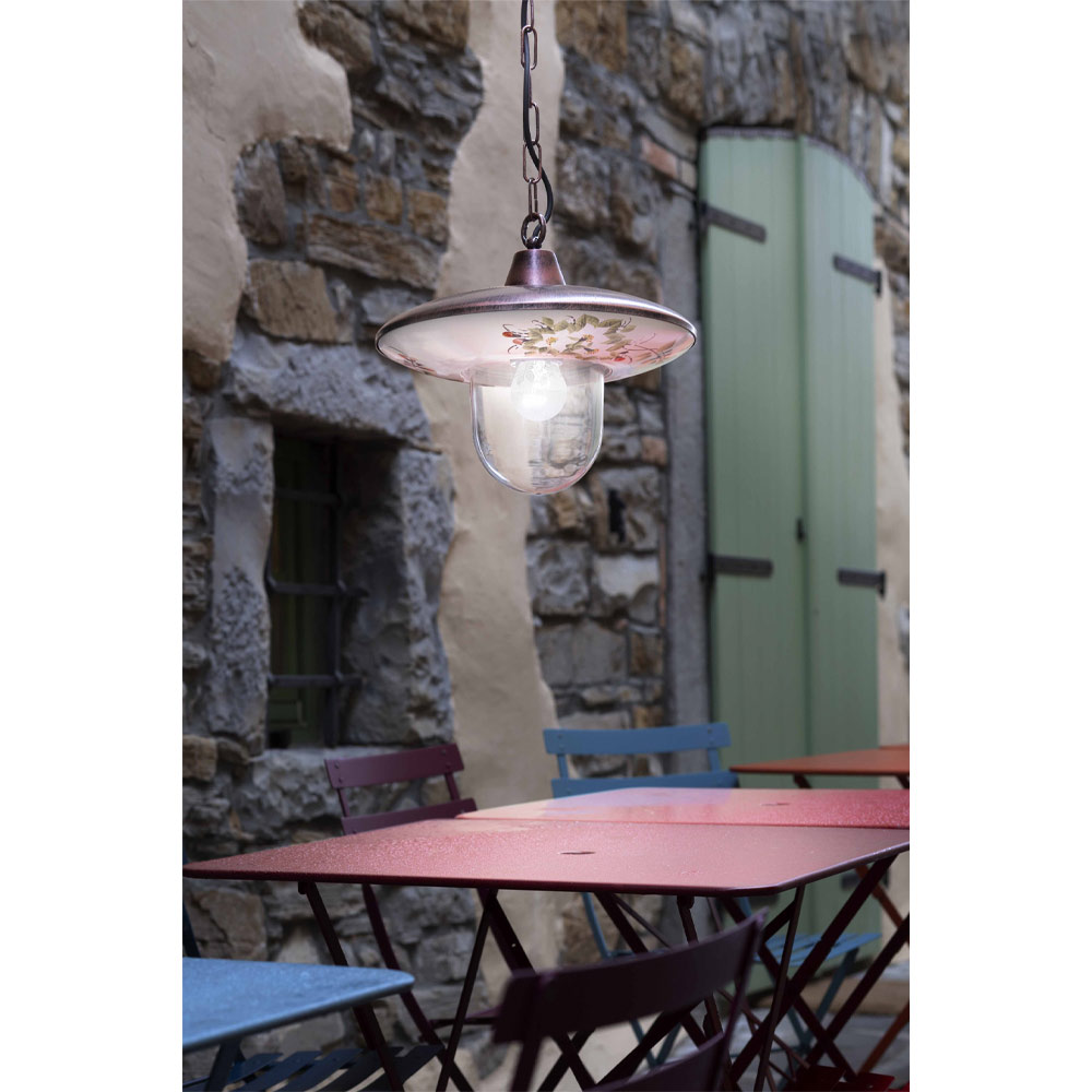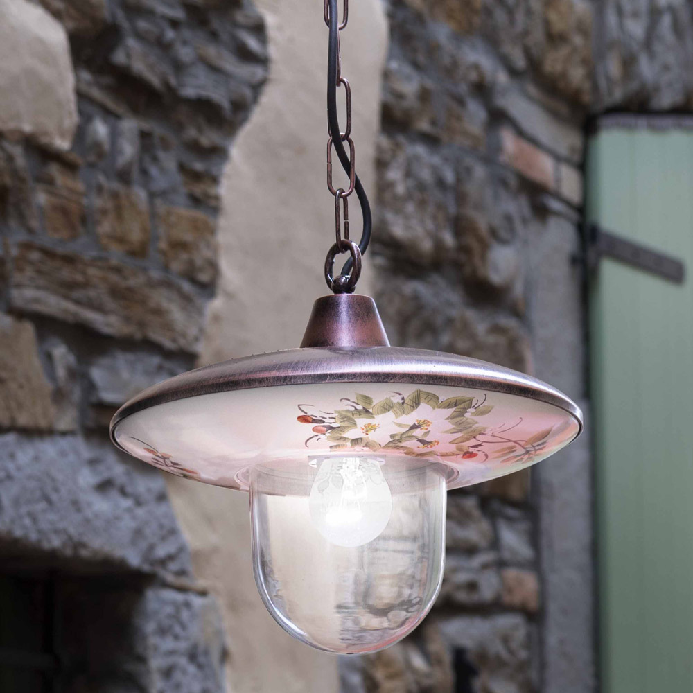 Diese Pendelleuchte für den Außenbereich ist vollständig aus schwarzem Aluminium mit kupferfarbenem Schirm gefertigt und mit handbemalten Blumen für einen klassischen und harmonischen Stil zwischen Form und Farbe verziert.