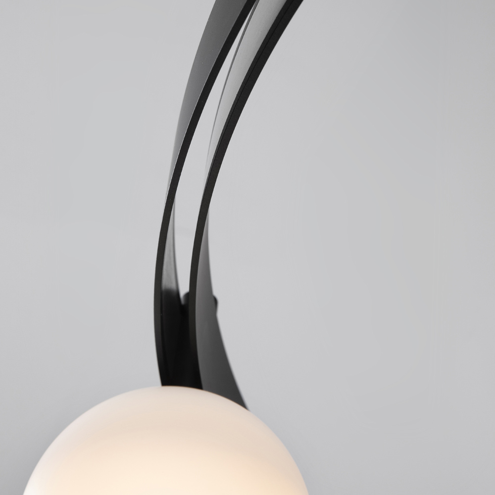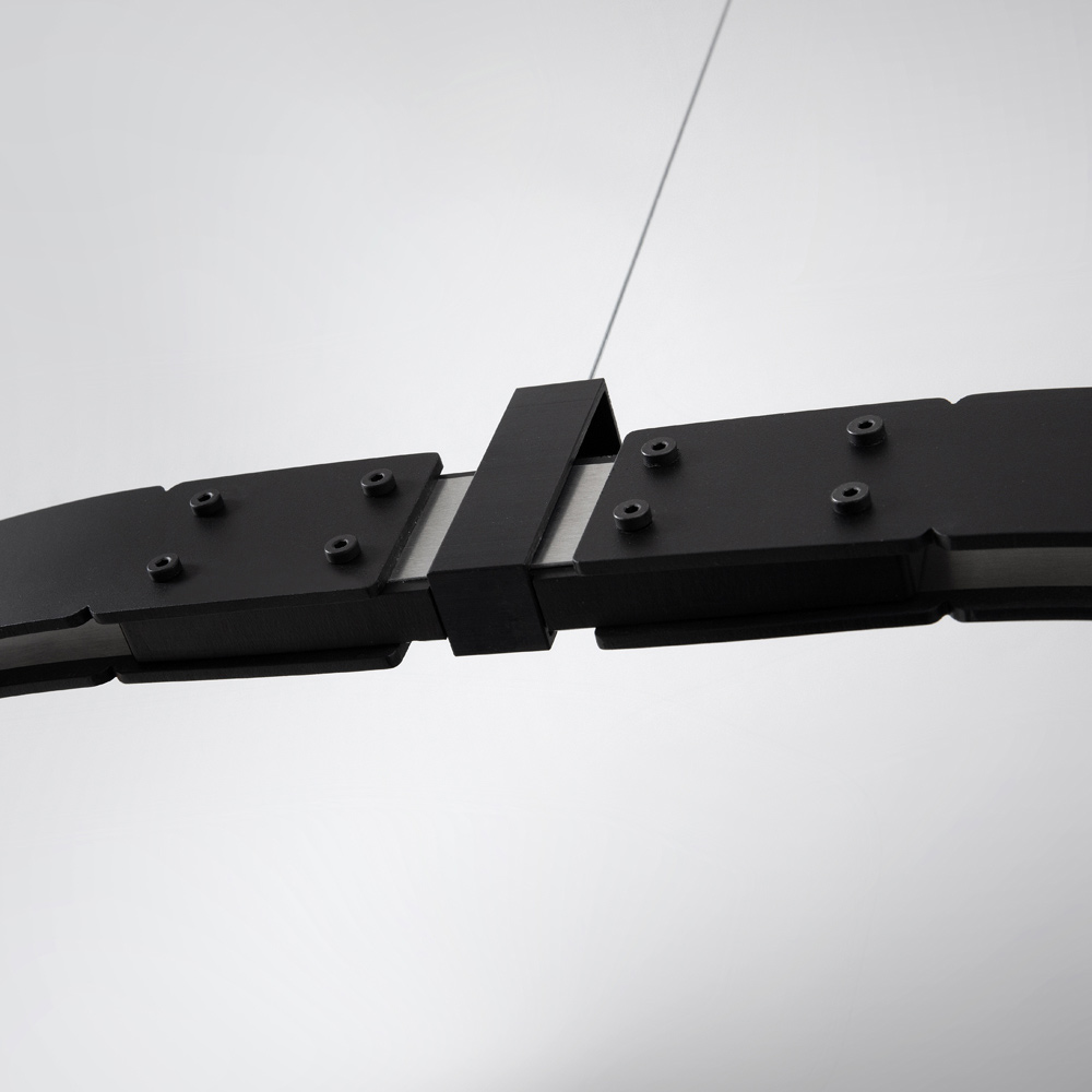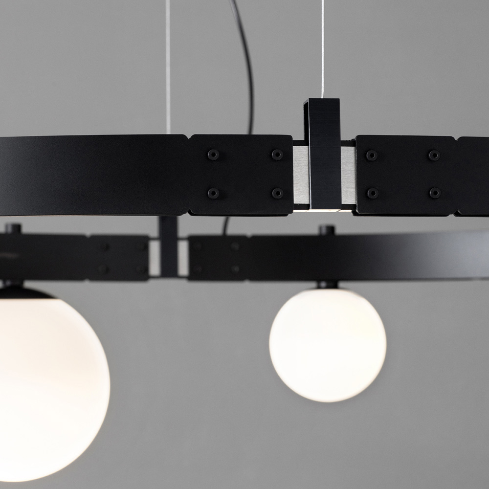 Die ovale Tragstange erinnert an die Ingenieurbauwerke der Vergangenheit und die elektrifizierten modularen Strukturen tragen Lichtkörper ( geblasene Glaskugeln in zwei verschiedenen Größen), die in Quantität und freier Anordnung ohne Verwendung von Stromkabeln platziert werden können, für maximale Freiheit von Ausdruck.